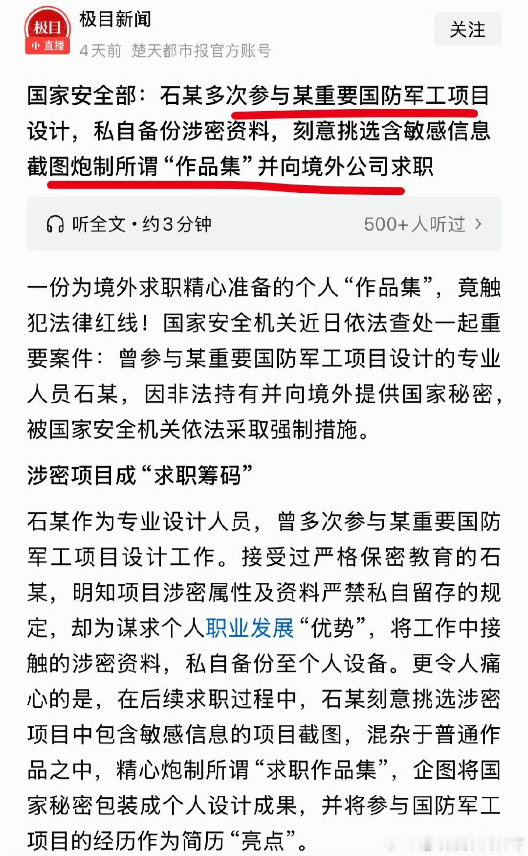 国安部又曝光间谍!参与军工项目,可刻意挑选敏感信息,把涉密资料包装成作品集向境外公司求职!