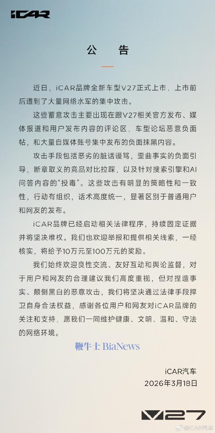 3月18日,iCAR汽车发布公告称,近日,iCAR品牌全新车型V27正式上市,上市前后遭到了大量网络水军的集中攻击。