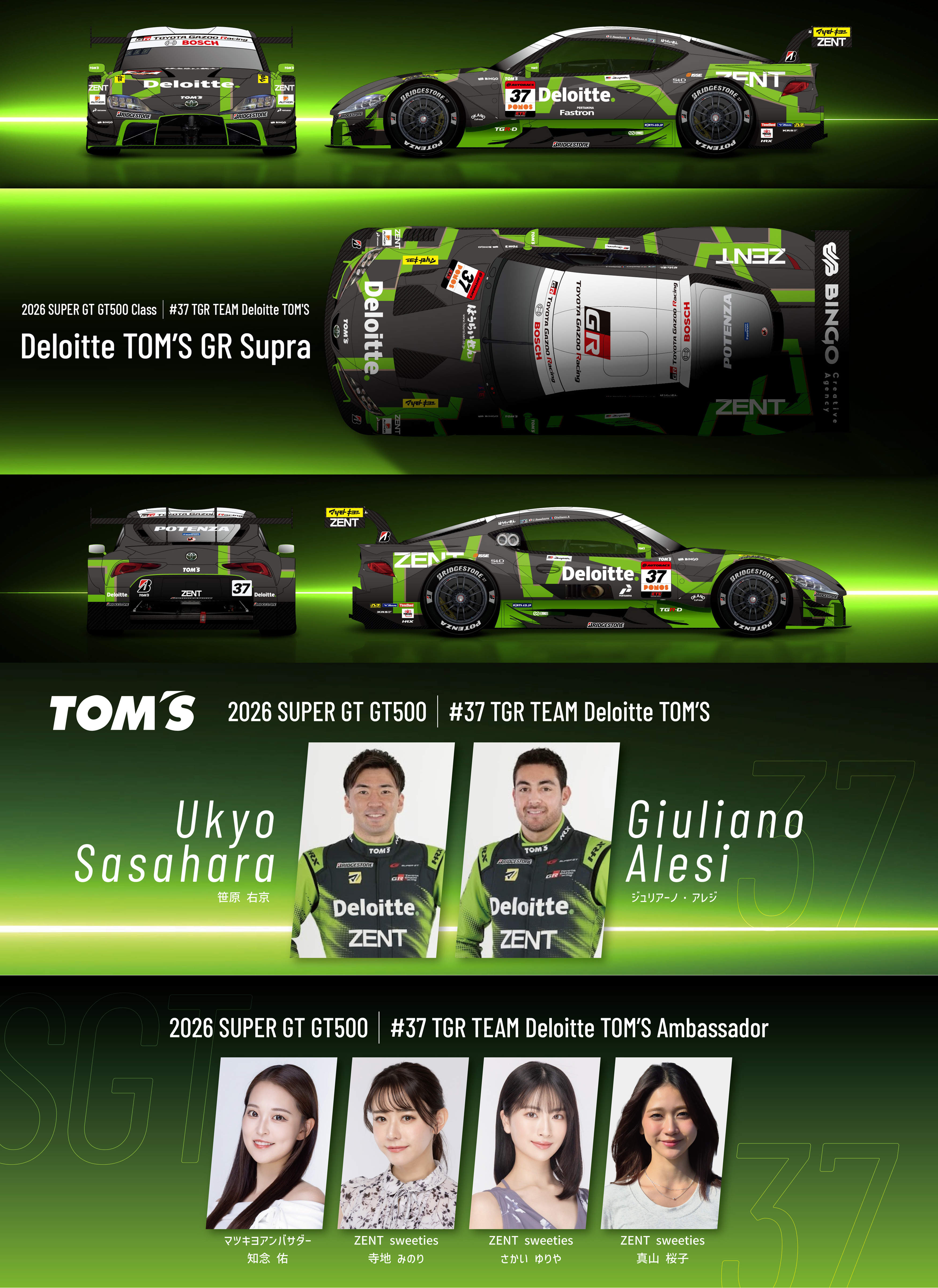 新赛季TOM'S依然运营两台丰田GR Super GT500参赛,其中au TOM'S的车号从1号改回了36号,而Deloitte TOM'S则继续使用73号;车手阵容未作变化,山下健太、坪井翔、笹原右京与小阿莱西继续为车队征战,不过赛手服就用了新的设计。
