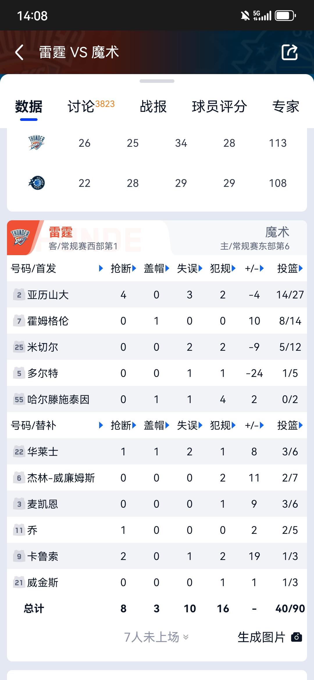 雷霆真正令人恐怖的地方 雷霆客场113-108,拿下魔术。在赛季还剩13场的情况下,拿到第54胜,领先第七太阳15个胜场,提前锁定季后赛名额。亚历山大40分5篮板2助攻4抢断,常规操作,不算什么,令人恐怖的是一个稀有的细节。 雷霆本场5位先发,有3位正负值为负数,其中亚历山大-4,米切尔-9,多尔特-24!意味着雷霆主力在场,是输球的!但球队还能顺利拿下,因为所有替补的正负值,都是正的! 这就太无解了,因为主力再强,都有状态不好的时候,但有替补能托底,完全无后顾之忧!还有一个点,本赛季亚历山大、杰威、切特,都有缺席的时候,但卡森华莱士、米切尔、杰林威廉姆斯,几乎可以平替!三人同时缺席,卡森华莱士也曾带领球队连胜!现在雷霆是缺人也不怕;客场也不怕;状态不好还不怕!进攻本来就无解,防守还联盟第一!他们的弱点到底是什么?
