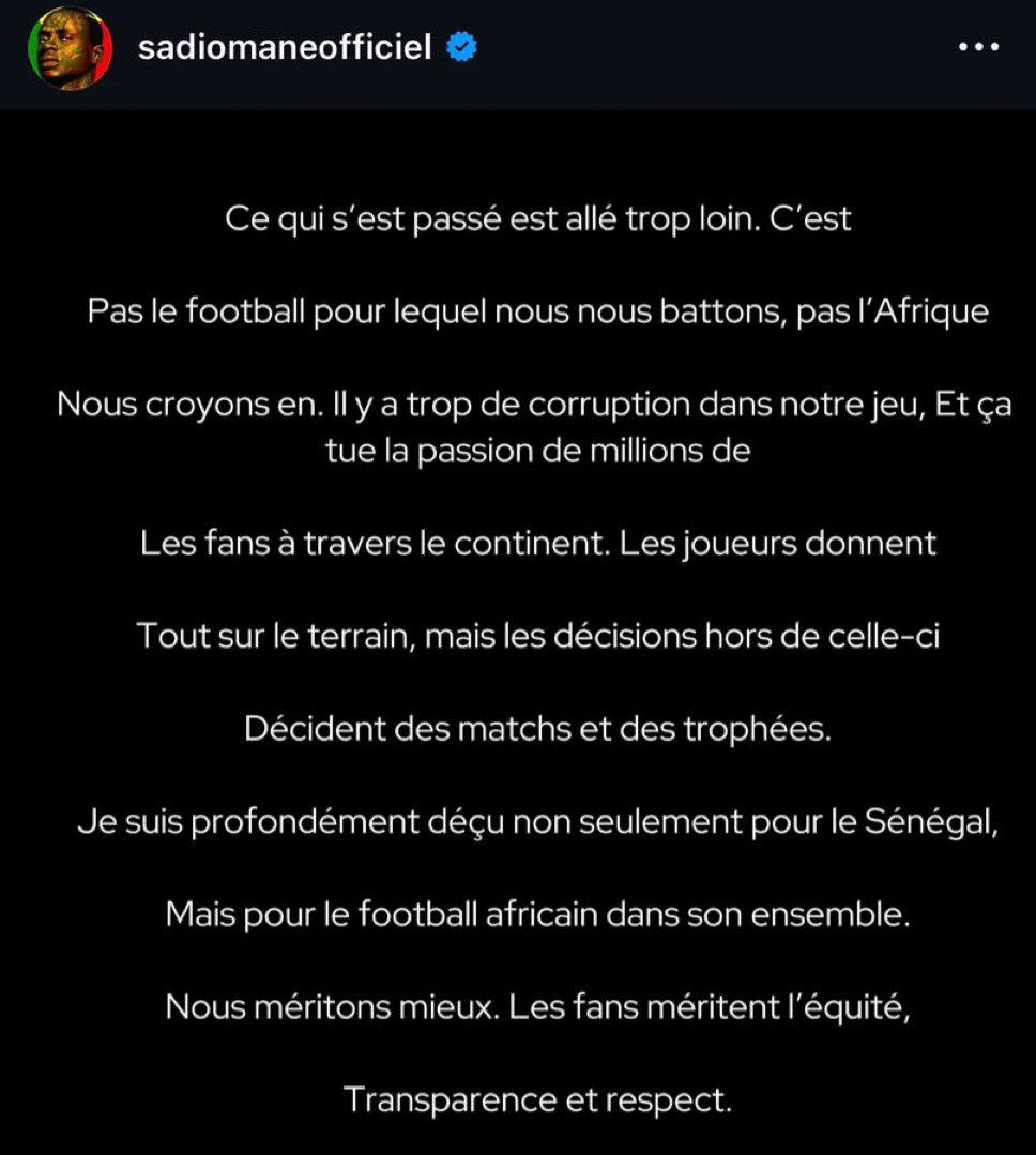 马内第一时间在ig上发布了这段声明,似乎又删除了:发生的这一切实在太过分了。这不是我们为之奋斗的足球,也不是我们所信仰的非洲。我们的足球世界里充斥着太多腐败,这正在扼杀整个大陆数百万球迷的热情。球员们在球场上倾尽所有,但场下的决定却左右着比赛的胜负和奖杯的归属。我不仅为塞内加尔感到深深失望,更为整个非洲足球感到痛心。我们理应得到更好的对待。球迷们理应获得公平、透明与尊重。