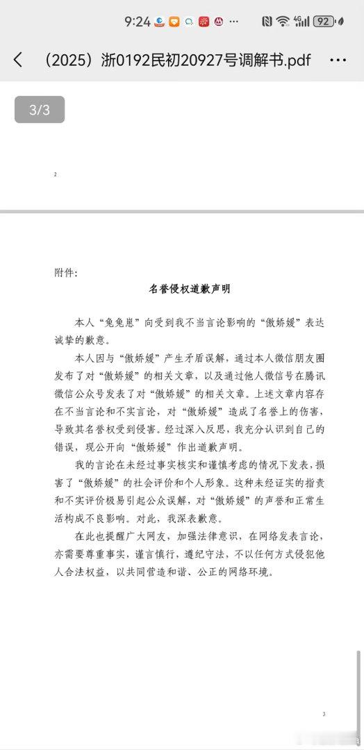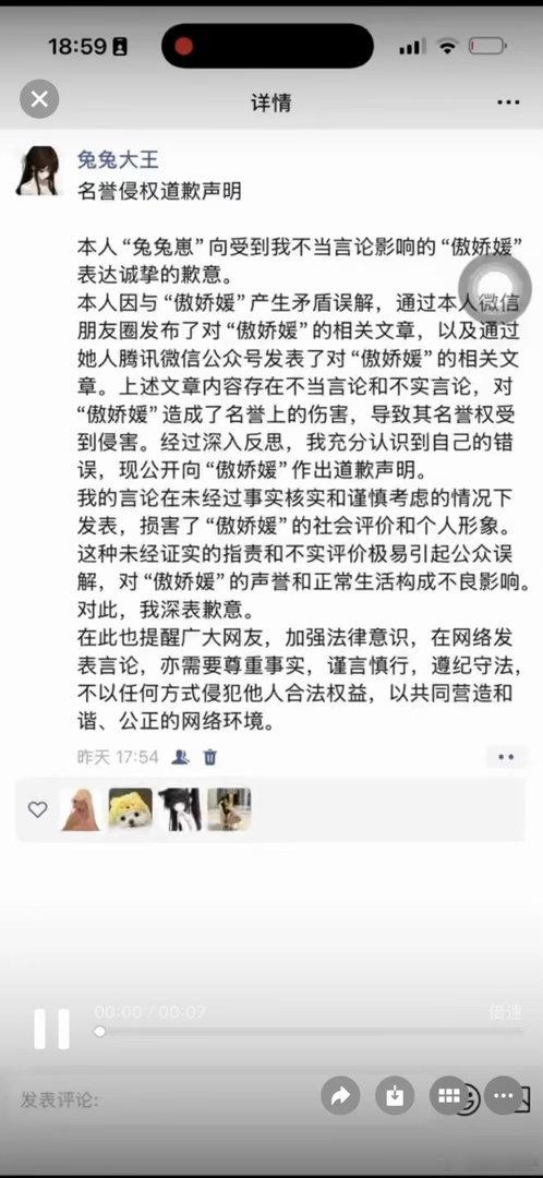 网络不是法外之地,“人美心善兔兔崽”你造谣诽谤终会付出代价。此事我已通过法律途径维权,对方已承认全部侵权事实,并正式发布《名誉侵权道歉声明》,公开承认其发布的内容均为不当、不实言论,明确向我致歉,承诺承担相应责任。相关聊天记录、道歉文件、公开致歉截图均为真实有效凭证,足以证明:做假截图为了诋毁用尽了心机 以后不与消耗我的小人纠缠 交朋友要擦亮眼睛