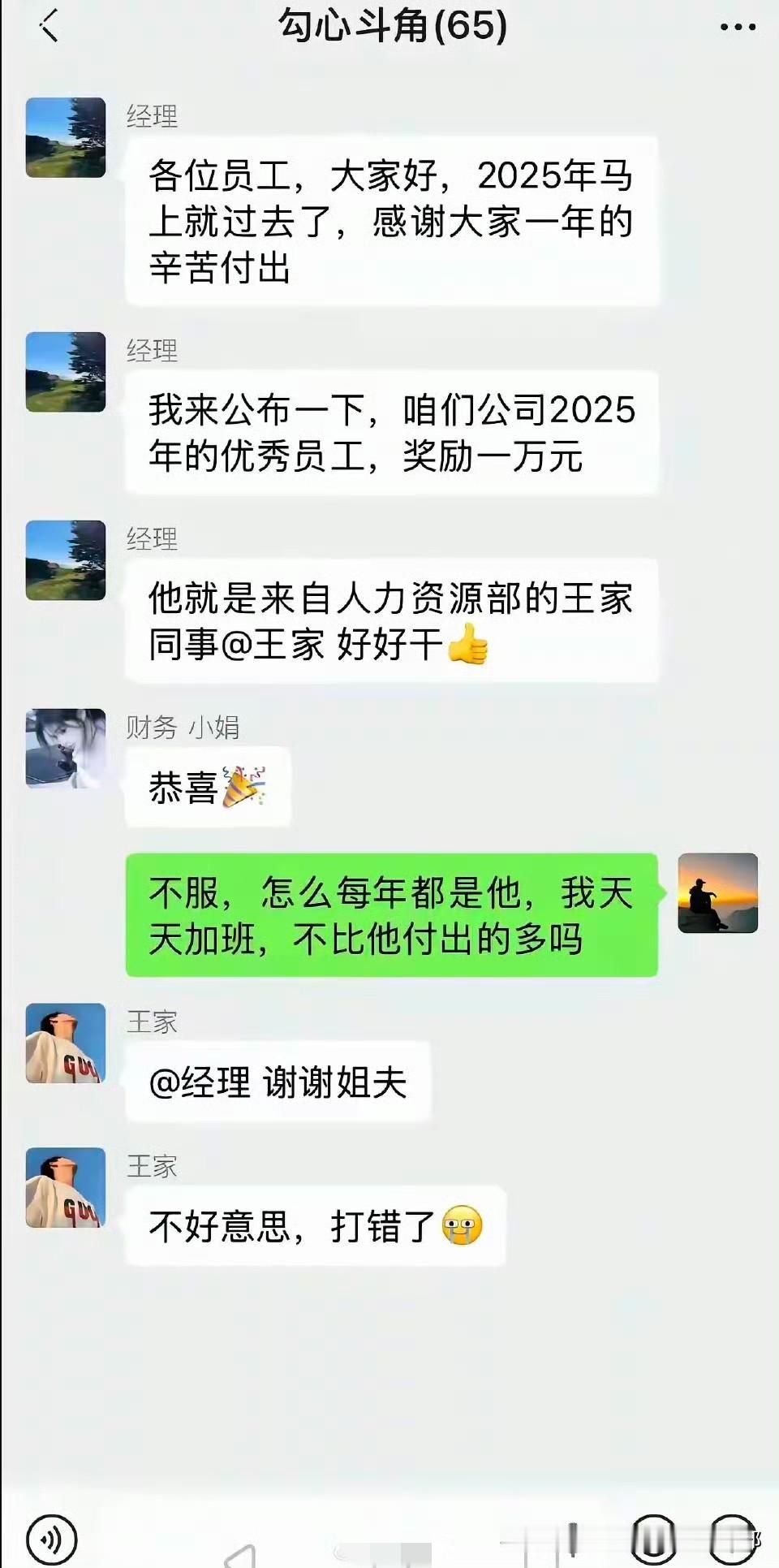 某公司群里发生了一件特逗的事。经理发通知,说2025年优秀员工是人力资源部的王家,奖励一万块。消息刚出来,就有同事不服气,说:“怎么每年都是他?我天天加班,不比他付出多吗?” 结果你猜怎么着?王家立马跳出来,@了经理一句:“谢谢姐夫!”没过两秒,又补了句:“不好意思,打错了。” 群里瞬间安静了。 真的,我当场笑出声。这哪是打错字啊,这分明是“不小心”暴露了真相!难怪人家年年优秀,原来是一家人。 想起以前待过的一家小公司,年会抽奖从来没悬念——中的永远是老板的小姨子、表侄子、远房外甥……奖品从手机到旅游券,肥水那是一滴都没流外人田。底下员工只能跟着鼓掌,心里跟明镜似的。 有网友调侃得特到位:“跟你说了多少次了,工作的时候称职务!”现在想想,这话真不是段子,是职场生存笔记啊。 家族企业有时候垮得快,真不是没理由的。干活时让你拼命,分好处时全是自己人,谁还愿意真心卖力?表面一套背后一套,时间长了,人心就散了。