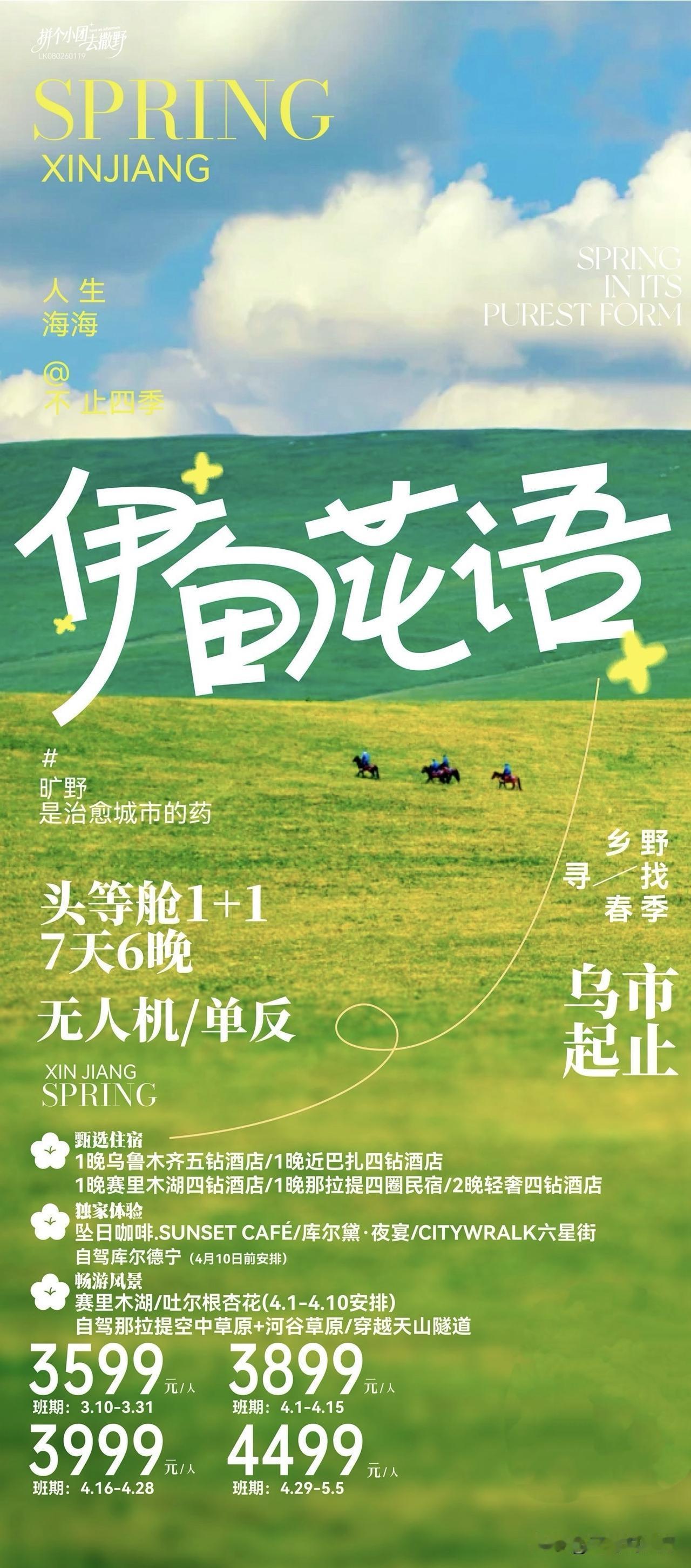 伊甸花语·1+1头等舱|新疆7日小团之旅 📍𝙓𝙞𝙣𝙅𝙞𝙖𝙣𝙂 春风入疆,限定浪漫上线✨ 2–6人精品小团,单人单座舒适出行,拒绝拥挤,轻奢自由。 🌿 核心亮点|那拉提野奢升级 4月15日前报名,免费升级景区内五钻野奢酒店 用亲民价格,住进雪山草原深处,睁眼就是仙境。 ⏱ 7天短途,体验感直接拉满 自驾环湖赛里木湖,漫步库尔德宁、那拉提空中草原 4.1–4.10限定杏花季,穿越天山胜利隧道,一路繁花相伴。 赏赛湖绝美落日,品坠日咖啡、馕咖甜点 享库尔黛夜宴,烤全羊+民族歌舞,沉浸式感受地道新疆味。 🏡 全程高配住宿不将就 乌鲁木齐五钻酒店|国际巴扎四钻酒店|那拉提野奢住宿 吃住舒适,出行省心,深度玩遍北疆精华。 不用太长假期,也能拥有顶配春日。 7天,用不贵的时间,过很贵的春天。 花期有限,席位紧张,速约出发🌷