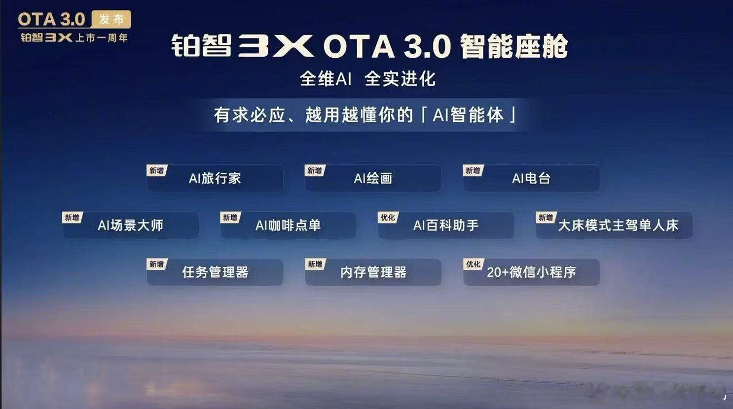 丰田铂智3X上市一周年重磅OTA丰田铂智3X升级R6大模型广汽丰田铂智3X上市一周年,给8万车主送上免费重磅OTA,新老车主一视同仁,太良心!Momenta R6大模型上车,智驾更像老司机,加塞、汇流、鬼探头都处理得顺滑自然,还能看行程报告。6个AI助手、20多款微信小程序上线,一句话点咖啡、规划路线超方便。安全再升级,脱手提醒、安全靠边更靠谱。不割韭菜、核心功能全免费,难怪连续5个月合资新能源销冠,这波宠粉真的爱了!