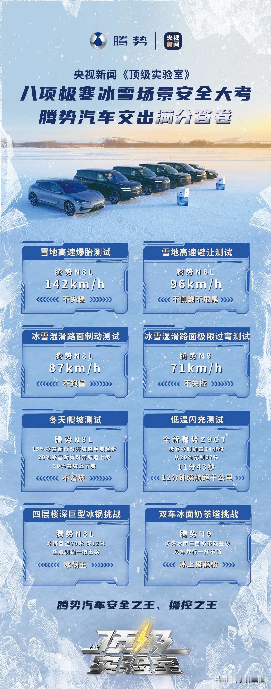 央视新闻又一次站台比亚迪! 比亚迪这次的二代刀片电池+二代闪充这事情真的搞得有点大啊! 继比亚迪3月5日发布二代刀+二代闪充技术后,比亚迪再次出现在央视新闻中,而且还是央视专栏直播节目-顶级实验室! 时间3月16日,地点内蒙古牙克石,测试车型腾势N8L、腾势N9、腾势Z9GT,测试项目:直径70米,深度12米(约等于4层楼高)巨型冰锅挑战、低温闪充测试、雪地爬坡测试、雪地高速爆胎测试、冰雪湿滑路面制动测试、冰雪湿滑路面极速过弯测试、雪地高速让测试以及双车冰面奶茶挑战8项测试。 最终成绩 腾势N8L 140Km/h雪地高速爆胎-稳行, 腾势N8L 96Km/h雪地高速避让-不侧翻不甩尾, 腾势N8L 87Km/h冰雪湿滑路面制动测试-不跑偏, 腾势N9 71Km/h冰雪湿滑路面极速过弯-不失控, 腾势N8L 雪地爬坡测试-不溜坡, 腾势Z9GT 零下30°静置24小时从20%-97%充电耗时11分43秒, 腾势N8L 挑战12米深大冰锅,丝滑刷锅一把出锅, 腾势N9 挑战极滑冰面三层奶茶碗叠放双车并行一杯不洒。 大家看到了吧?这就是比亚迪,这就是腾势,技术是天花板级别的,但外观跟营销还得努努力,不然再好的技术,没太多人用,多少还是会有点遗憾!