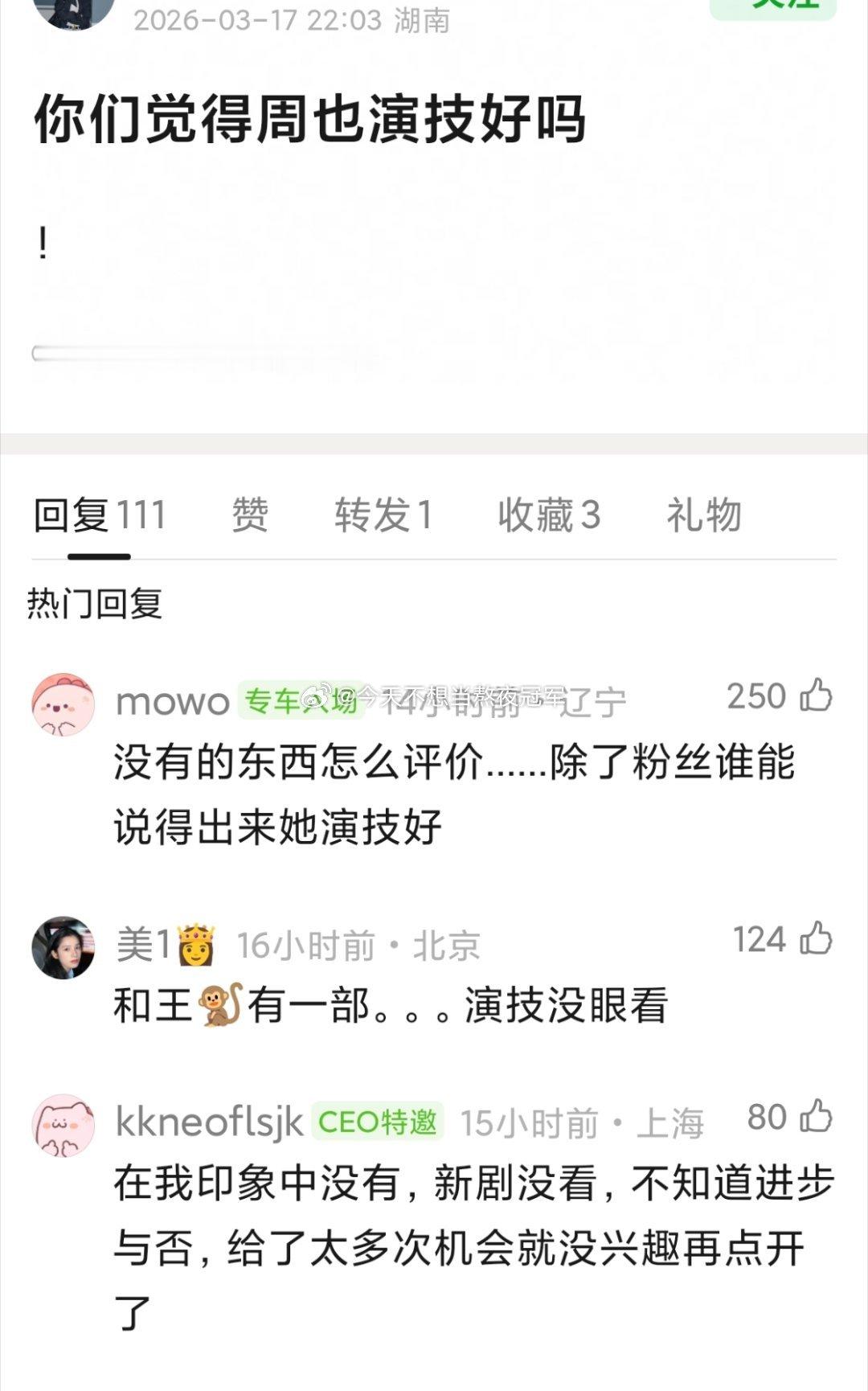 《你好1983》首日扑开,网友说周也已经在95🌸中掉 队,过两年就会变得查无此人刚扑一部大IP《女将星》,《你好1983》开播0声量,《一瓯春》男主💣太多,《红舞鞋》又因为撞🐱被大规模壁垒。🥥以后很难接到大IP女一了吧?🙉但女二她肯定又看不上。。。电影⭕现在也是寒冬,中腰部演员机会越来越少,🥥的演技更是个硬 伤李涛,周也以后的路到底该怎么走?周也换夏晓兰头像