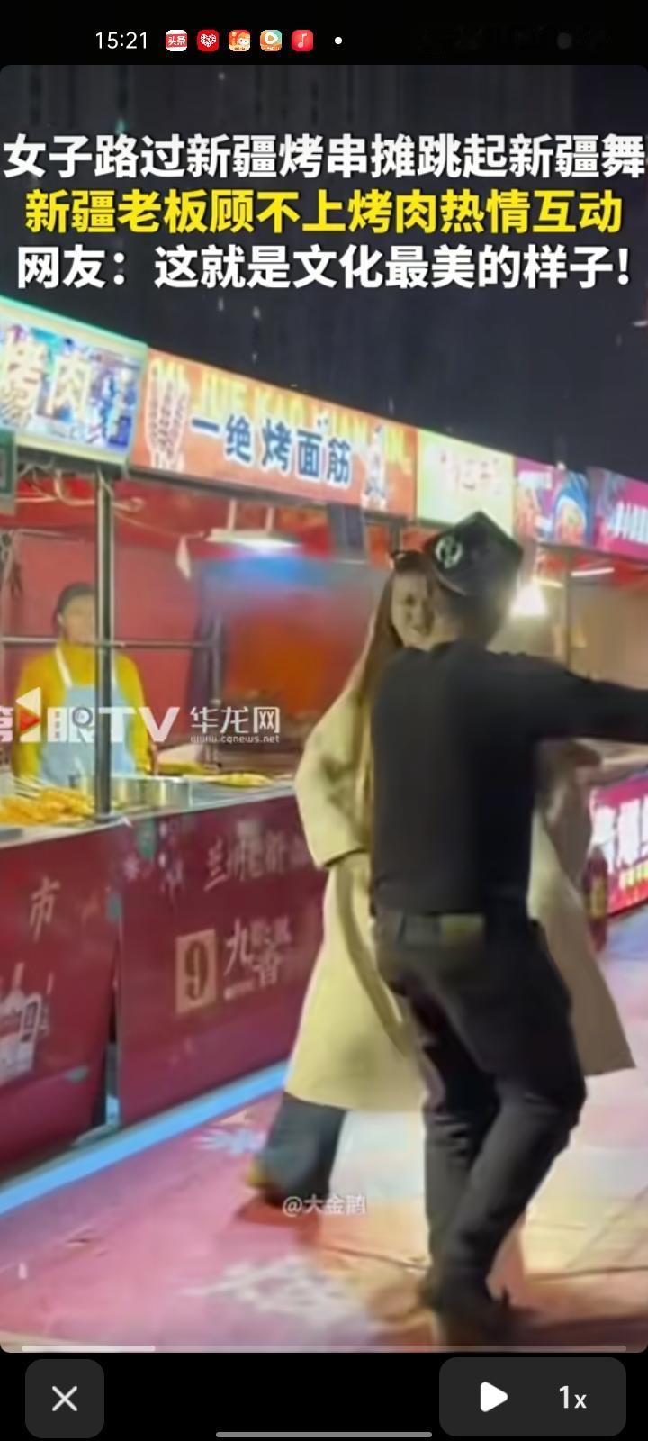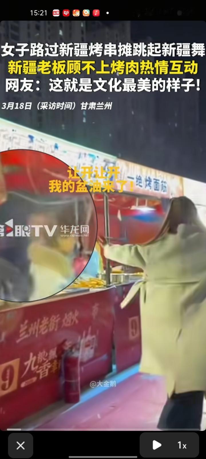 3月14日,甘肃兰州。女子路过新疆烤串摊跳起新疆舞蹈,摊位老板顾不上烤肉热情互动。 当事人马女士称,当时自己的心情是很激动的,但上去跳的时候,感觉有点胆怯和害羞,因为自己没在街头上跳过舞蹈,上去之后新疆小哥就特别热情,就和自己互动,感觉特别开心。