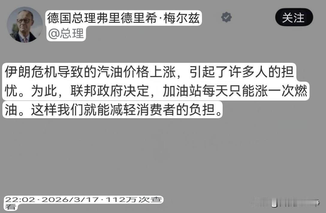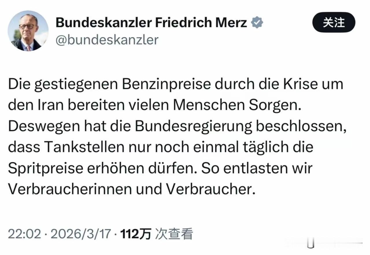 大家看看德国总理默茨说的这是什么虎狼之词啊? 深深的震撼了我的三观,德国现在通货膨胀到这个地步了吗? 德国总理在社交媒体上突然发了一个简短的贴 意思很简单,因为中东危机导致了汽油价格的上涨 这种价格上涨引起了非常多的人担忧 所以德国联邦政府决定加油站每天只能涨价一次 哎呦我去!难道说之前德国的加油站一天涨价好多次吗? 德国的通货膨胀狂到这个地步了吗? 物价一天涨好几次,这不让人想起当年的金圆券了吗? 堂堂德国欧洲工业的发动机,现在沦落成这个样子了? 怪不得他死活不肯派军舰呢,缺油缺到这个份上了,他怎么敢得罪伊朗呢?