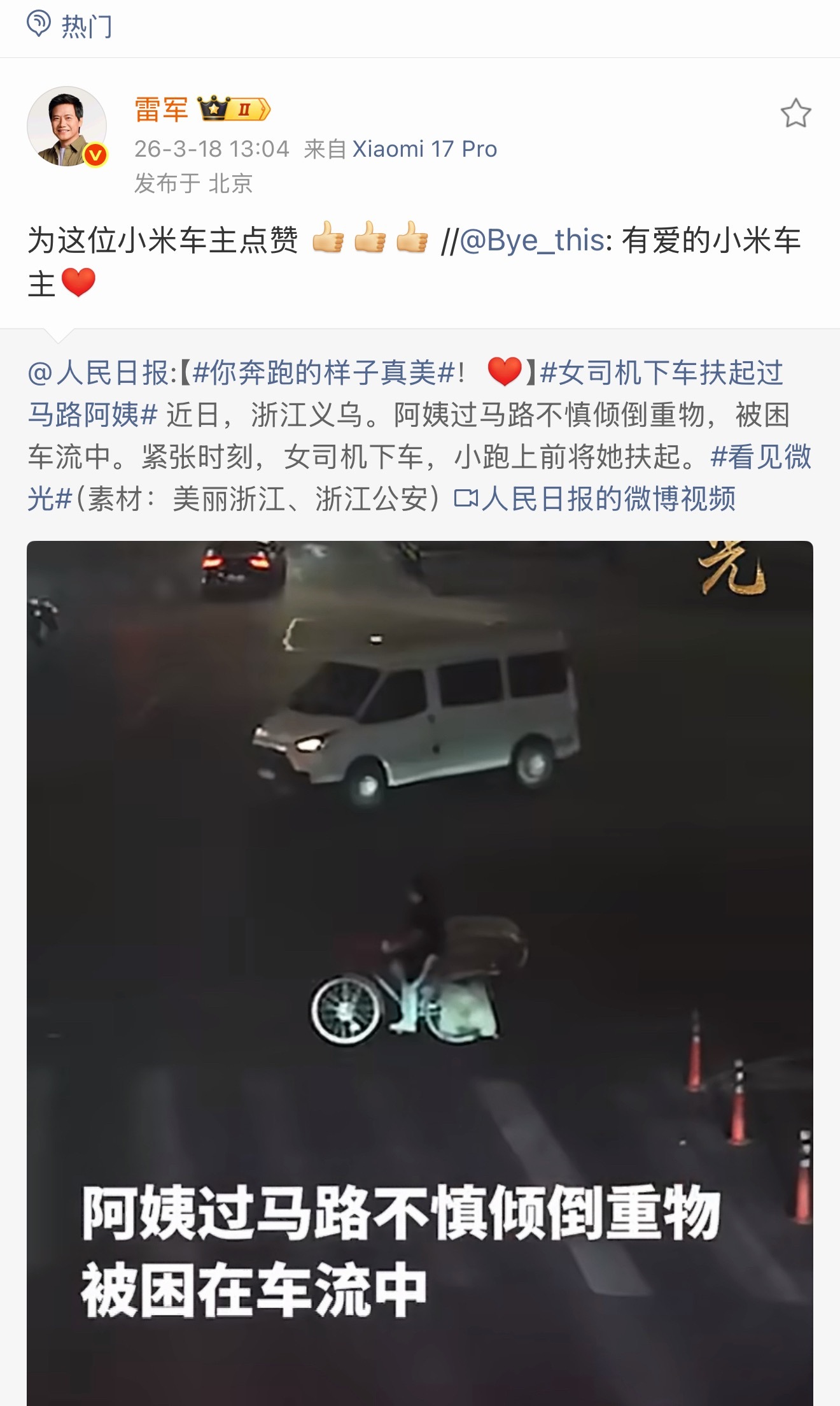 今天雷总亲自点赞了一个小米车主的视频,我仔细看了下,这波操作不管是从底层逻辑还是人情味来说都堪称满分。车主半路停车,帮一位阿姨把掉落的重物迅速搬到路边。表面上看,这确实让后车稍微等了几十秒,但如果从全局效率来算笔账:迅速排除路面障碍,不仅化解了阿姨身陷车流的巨大隐患,实际上更是避免了后续可能引发的拥堵,真正提高了整条道路的通行效率。科技向善不仅在产品,更在用户的日常里。就像车主说的,顺手做点好事,那种正向反馈带来的愉悦感是真的香!为这波高素质点赞!雷军点赞小米车主助人善举