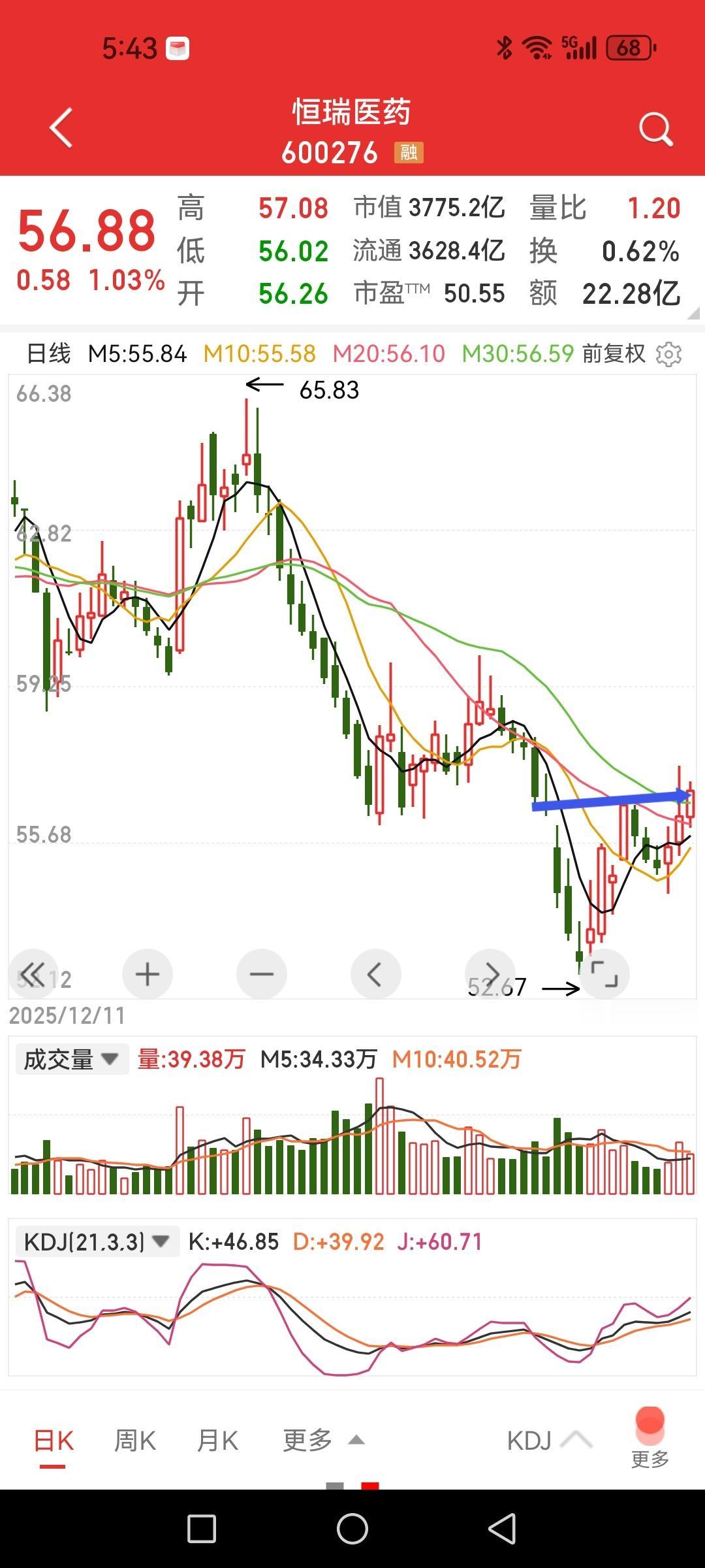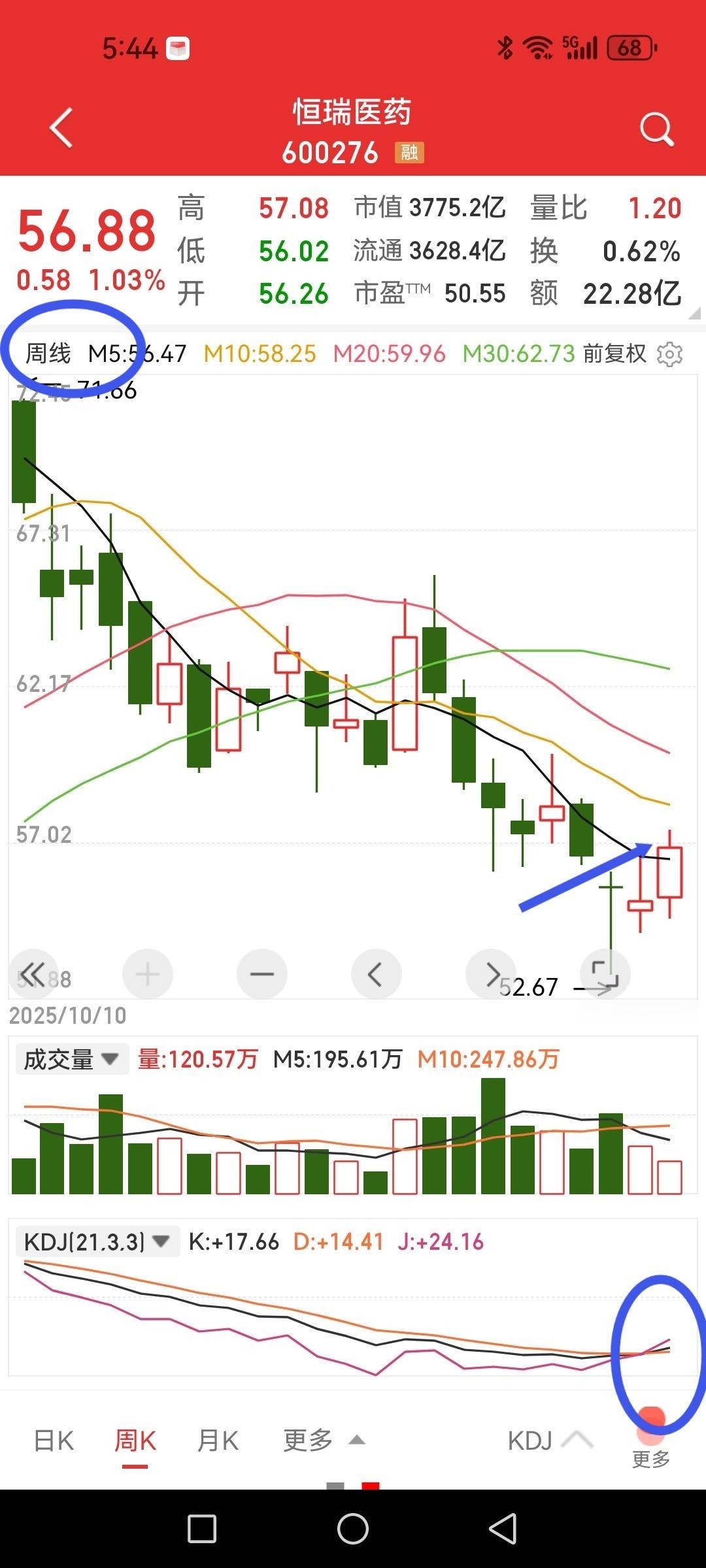 恒瑞医药日K线不知不觉站上5日、10日、20日、30日均线。 周线目前站上五周均线(本周暂时),KD低位金叉。布林线碰到下轨后连续向中轨反弹。 月线回调接近布林线中轨,如果本月能收阳则有望在月线布林线中轨附近止跌。