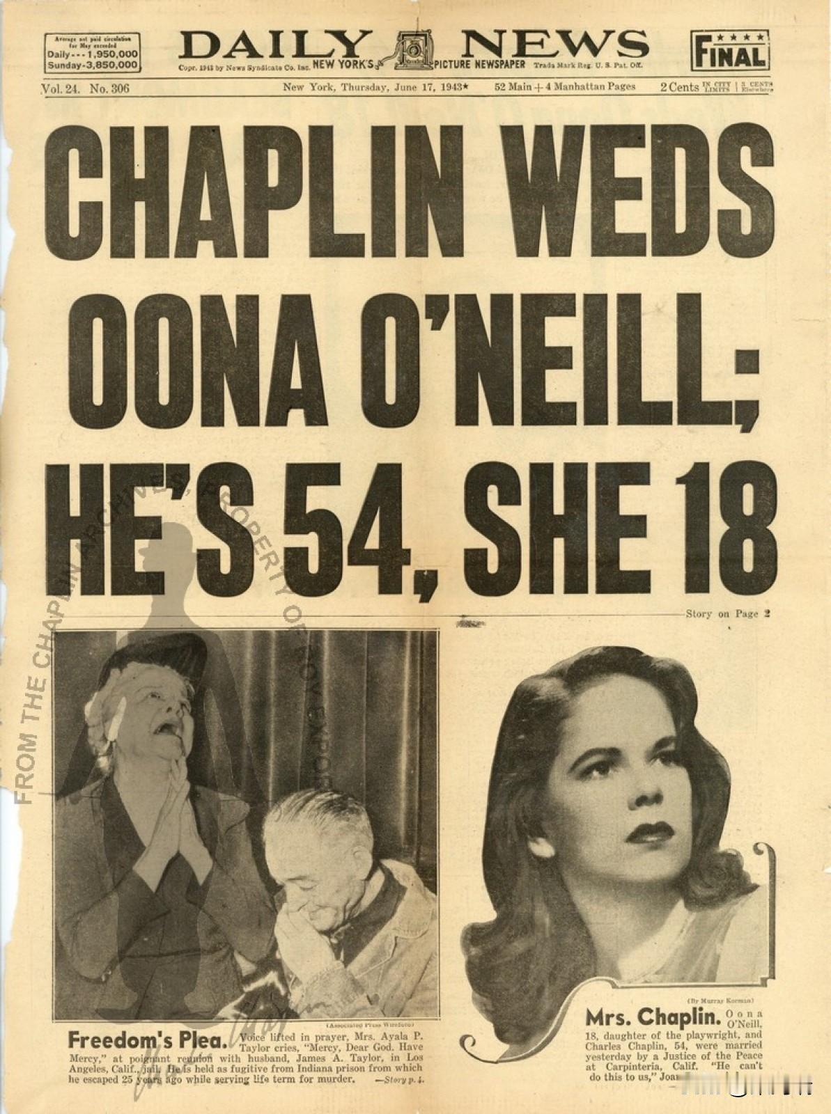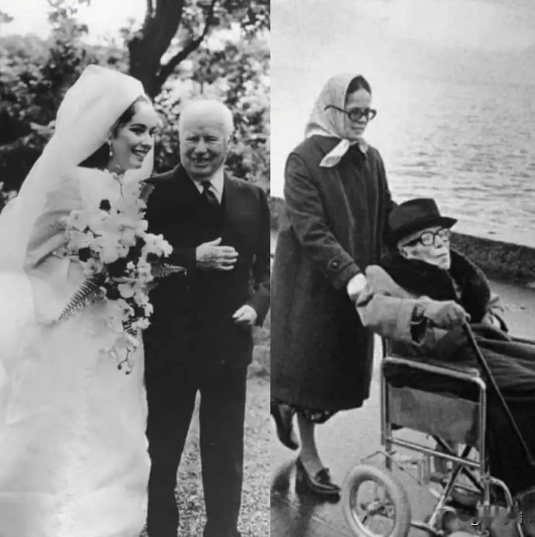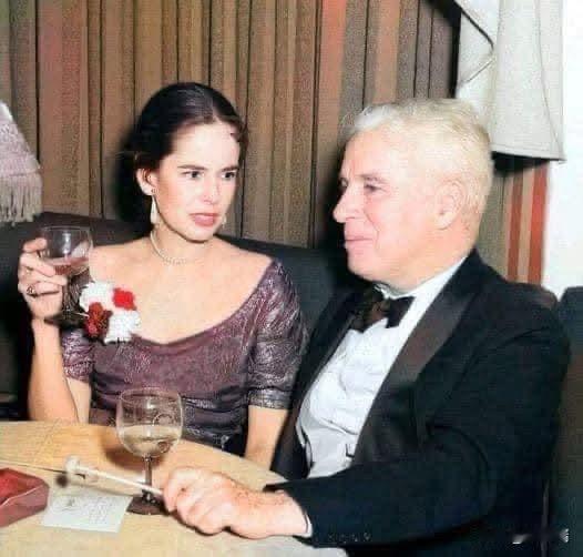 这张照片是著名喜剧大师查理·卓别林(Charlie Chaplin)与其第四任妻子乌娜·奥尼尔(Oona O'Neill)在一起的合影。 两人于1943年结婚。当时卓别林54岁,而乌娜年仅18岁。尽管存在36岁的年龄差距,但这被认为是一段非常幸福且长久的婚姻。他们共同育有8个孩子,并一直相守到1977年卓别林以88岁高龄去世。乌娜于1991年去世,终年66岁,她在丈夫去世后从未再婚。据记录,这张照片大约拍摄于1944年,地点是在好莱坞的一家夜总会。 值得一提的是,乌娜是1936年诺贝尔文学奖得主,美国著名剧作家尤金·奥尼尔的女儿。1943年两人结婚时,卓别林54岁,乌娜年仅18岁(因此她的父亲与她断绝了关系)。