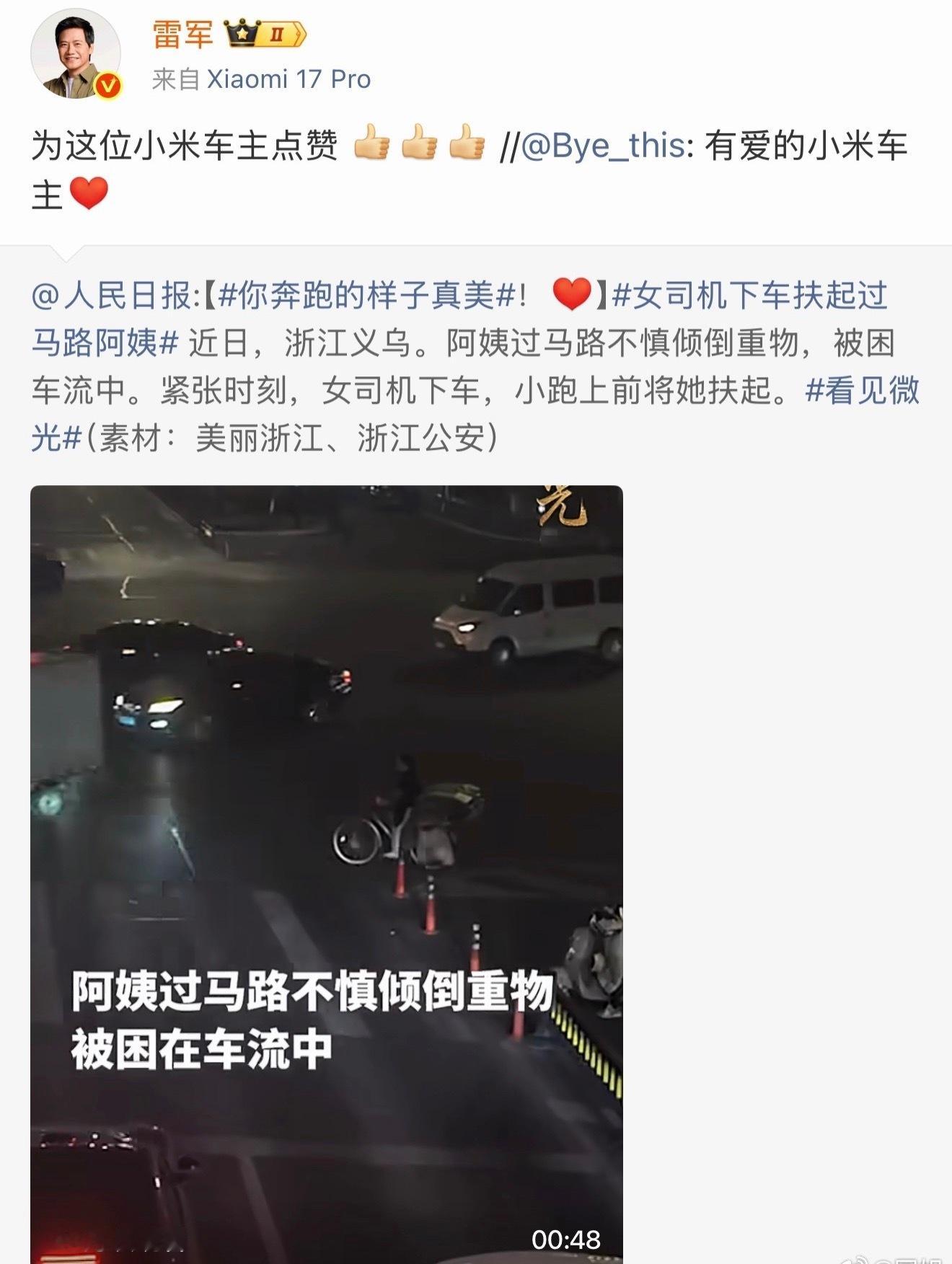 浙江的这位小米车主真的太酷了,路上有一位阿姨不慎摔倒,车来车往的很危险,但是这位女车主果断停车,第一时间上去搀扶帮忙,很平凡,但是很有力量,不仅仅被雷军点赞认可了,人民日报也转载了这件事,真好。雷军点赞小米车主助人善举