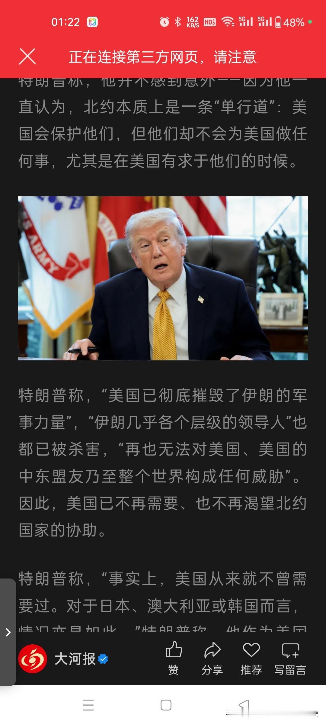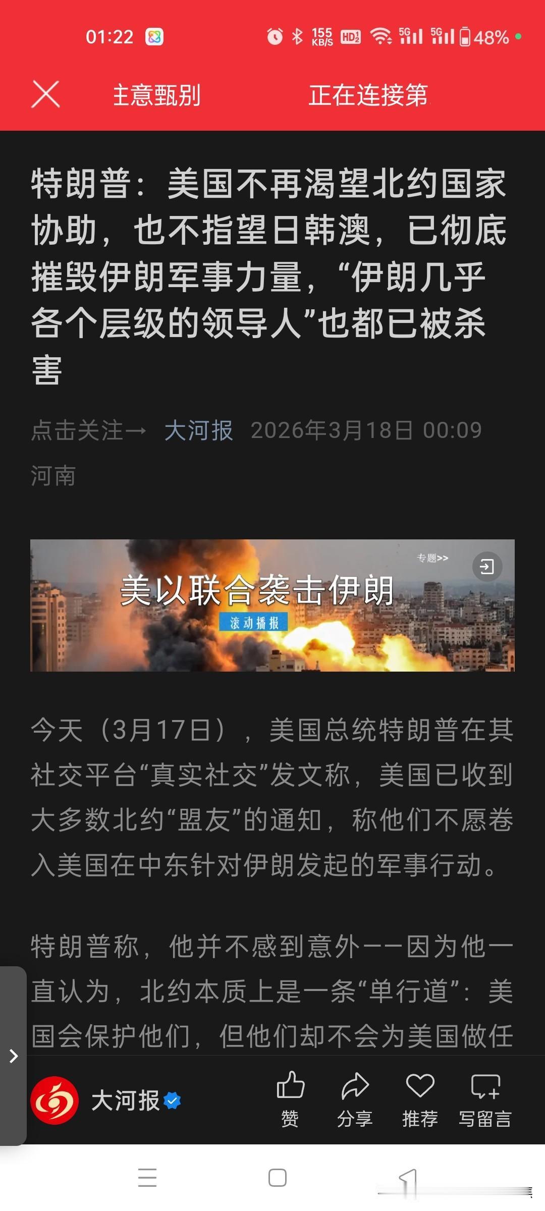 特朗普:美国不再渴望北约国家协助,也不指望日韩澳“伊朗几乎各个层级的领导人”也都已被杀害 核心表态:美国总统特朗普于 3 月 17 日发文称,美国已“彻底摧毁”伊朗的军事力量,且“伊朗几乎各个层级的领导人”均已被杀害,伊朗不再对美国及其盟友构成威胁 。 盟友态度:特朗普表示,大多数北约盟友已通知美国不愿卷入针对伊朗的军事行动。他对此并不意外,批评北约是“单行道”,并郑重声明美国“不再渴望”也不再需要北约国家,以及日本、韩国和澳大利亚的协助 。 背景冲突:此前美以联合对伊朗发动了持续数周的军事打击,造成包括伊朗高级军事指挥官在内的多人死亡,美方也有人员伤亡,战事曾引发地区紧张局势升级 。 风险提示:以上内容主要基于特朗普个人的社交媒体声明及部分媒体报道。关于“彻底摧毁伊朗军事力量”及“几乎所有领导层被杀”的说法属于单方主张,伊朗方面曾表示成立临时领导委员会并准备长期应对,国际社会对此类战果评估可能存在争议,实际局势仍需关注多方权威信源的进一步核实 。美国入侵伊朗 美军合围伊朗