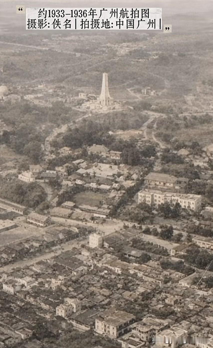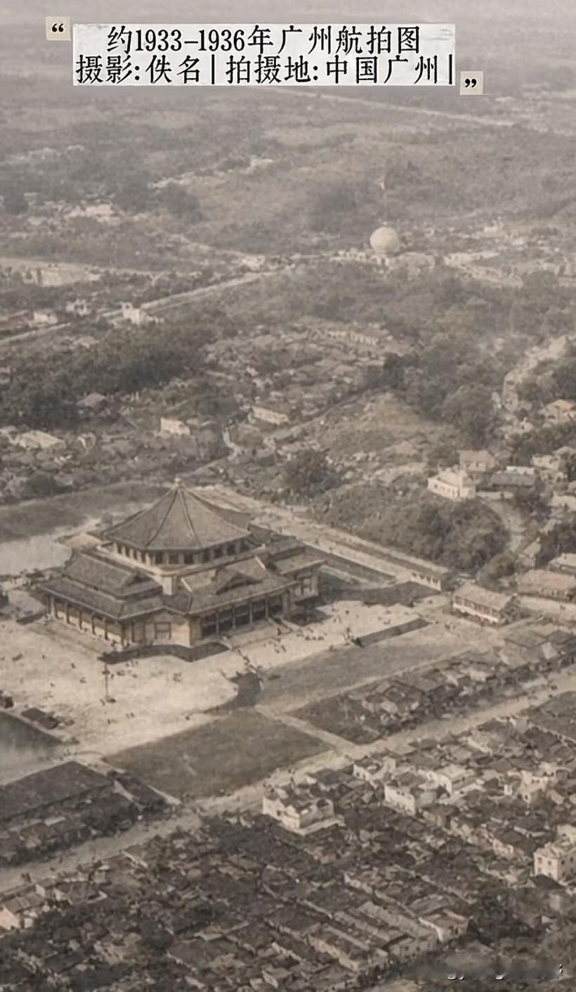 来看看1930年代的广州市航拍图。这应该是广州最早的航拍照片了吧。照片的拍摄者早已不知身份,但在那个年代能够乘坐飞机在城市上空拍照,绝对也是有一定实力的人。那个年代的广州,几乎都是低矮的房屋。至今保留下来的建筑主要就是镇海楼和中山纪念堂了。不过现在重新修整后的历史建筑比那时也漂亮气派多了。除了这些地标外,你还能从照片中识别哪些地方呢?