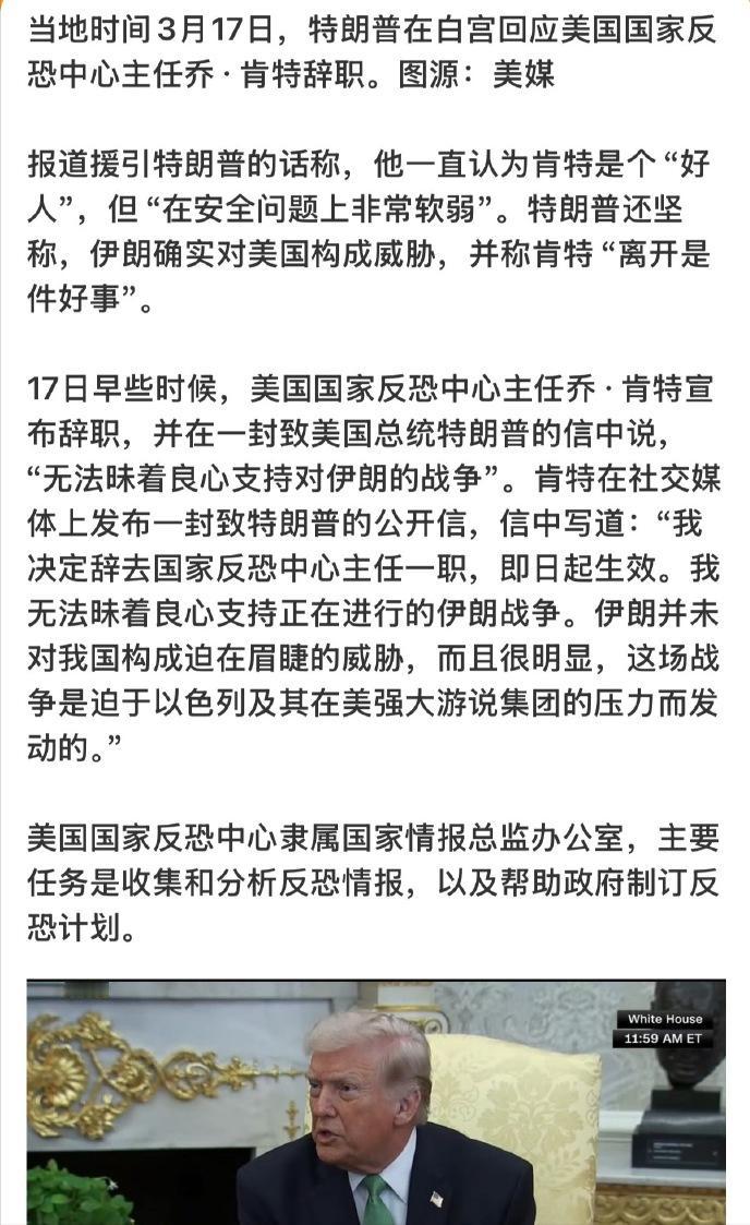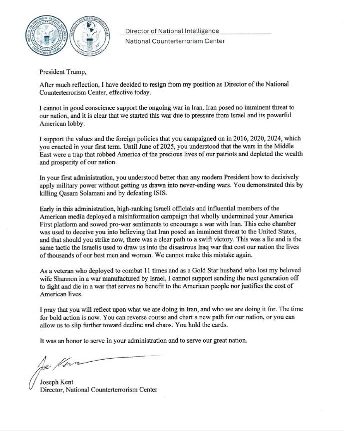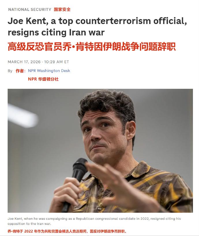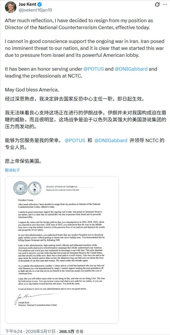 又一个亚伦·布什内尔,肯特致特朗普公开信原文曝光: “我无法昧着良心支持在伊朗持续的战争。伊朗对我国并未构成迫在眉睫的威胁,很明显,我们是在以色列及其强大的美国游说集团的压力下发动了这场战争。” 随后,特朗普在白宫强硬回应称:“他辞职是件好事,因为他曾说伊朗不构成威胁” 这场辞职风波背后或许藏着一段浸满血泪的个人往事。 肯特的第一任妻子香农·肯特于2019年在叙利亚服役期间身亡。 当时她在曼比季一处美军常用的餐厅外遭遇了 ISIS 策划的自杀式炸弹袭击,成为叙利亚反恐行动中首位阵亡的美军女性战斗人员。 香农的牺牲让肯特这位拥有20年特种作战经验、11次战斗部署经历的前绿色贝雷帽军官,对战争的代价有了最切身的体会。 有人推测,妻子离世后,肯特或许是怀着追查幕后真凶的执念,在反恐领域拼尽全力谋求晋升。从 CIA准军事行动官到国家反恐中心主任,他一步步登上情报体系的高位,获得了足够高的涉密权限,找到了凶手,结果发现凶手背后的老板是...... 所以如今他抱着最后的良心反对美国继续做这样的事。 2024年2月25日,25岁的美国空军现役网络防御专家在以色列驻美大使馆前自焚,抗议美国支持以色列在加沙的军事行动,以自己的生命表达了对美国中东政策的反对。 如今,乔・肯特以辞职+公开信的方式,同样以个人仕途和政治生命为代价,公开反对美国对伊朗开战,这是“又一个布什内尔式的良心反抗”, 他们的核心都是对美国被以色列游说集团裹挟、卷入无意义中东战争的强烈抗议,是对人类良知的忠诚捍卫。 可这又有什么用?不会在特朗普和内塔尼亚胡的心上泛起一丝涟漪。