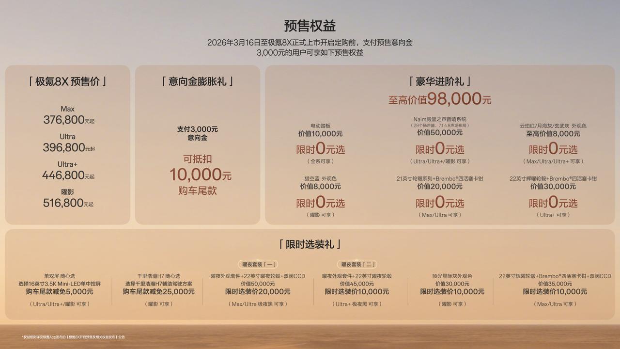 极氪8X预售价格:,Max、Ultra、Ultra+预售价分别为37.68万元起、39.68万元起、44.68万元起,曜影预售价为51.68万元起。官方还同步推出多重预售权益,包括至高价值98000元的「豪华进阶礼」、六项「限时选装礼」、3000元「意向金膨胀礼」,预计2026年第二季度上市 该车定位直接对标宝马X5、保时捷卡宴等传统豪华性能车型。 动力与续航:新车基于基于浩瀚-S超级电混架构打造,全系标配全栈900V高压架构。提供55kWh和70kWh两种6C超快充混动专用电池,其中70kWh版本CLTC纯电续航达410公里,综合续航里程高达1416公里。支持最快9分钟完成20%-80%电量补充。搭载2.0T超级电混专用发动机。双电机版峰值功率660kW,零百加速3.7秒;8X曜影版搭载三电机兆瓦级电驱,综合功率达1030kW(超1400马力),零百加速仅2.96秒。 首发AI智慧能源管理系统与行业首创“十源热泵”全域热管理,支持纯电、混动串联、混动并联、燃油直驱、动能回收等五大类共12种动力模式智能切换,确保满电与馈电状态下性能输出稳定。 底盘与操控:搭载4S级认证的浩瀚AI数字底盘,配备同级唯一的闭式双腔空气悬架、双阀CCD电磁减振器及主动稳定杆,实现“一车千面”的动态适应能力。 曜影版(专属配置):配备6活塞布雷博高性能卡钳、倍耐力315mm宽胎,以及500毫米涉水深度模式,强化极端路况通过性。 安全与智能:采用浩瀚安全盔甲设计,行业首发双门环+双金箍棒结构,构建高强度防护。首搭新一代千里浩瀚G-ASD辅助驾驶系统,凭借高算力硬件与大数据集,实现全场景真无图智驾体验。