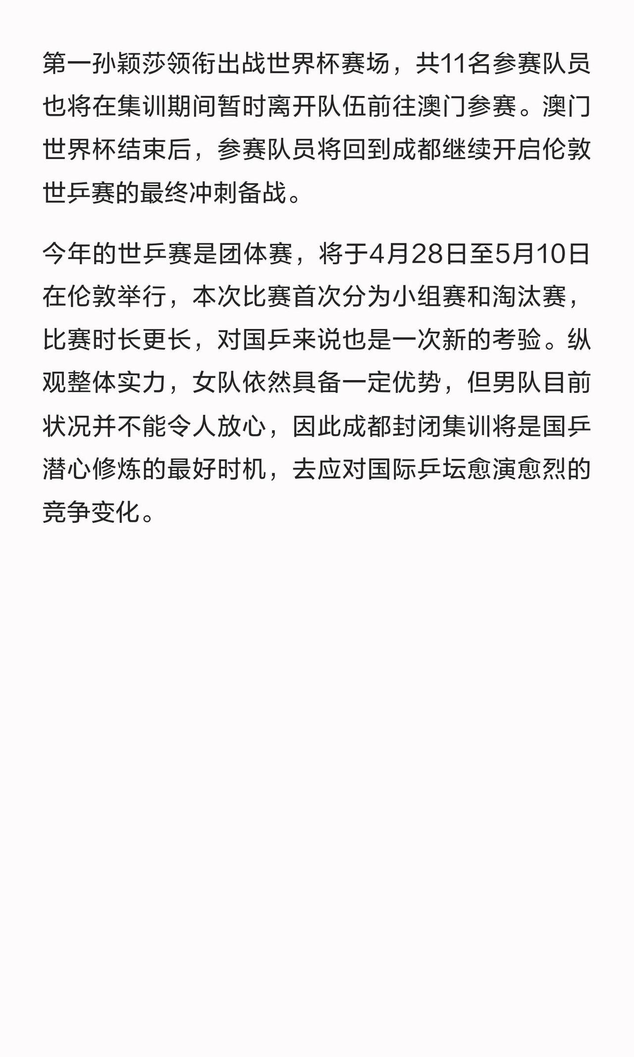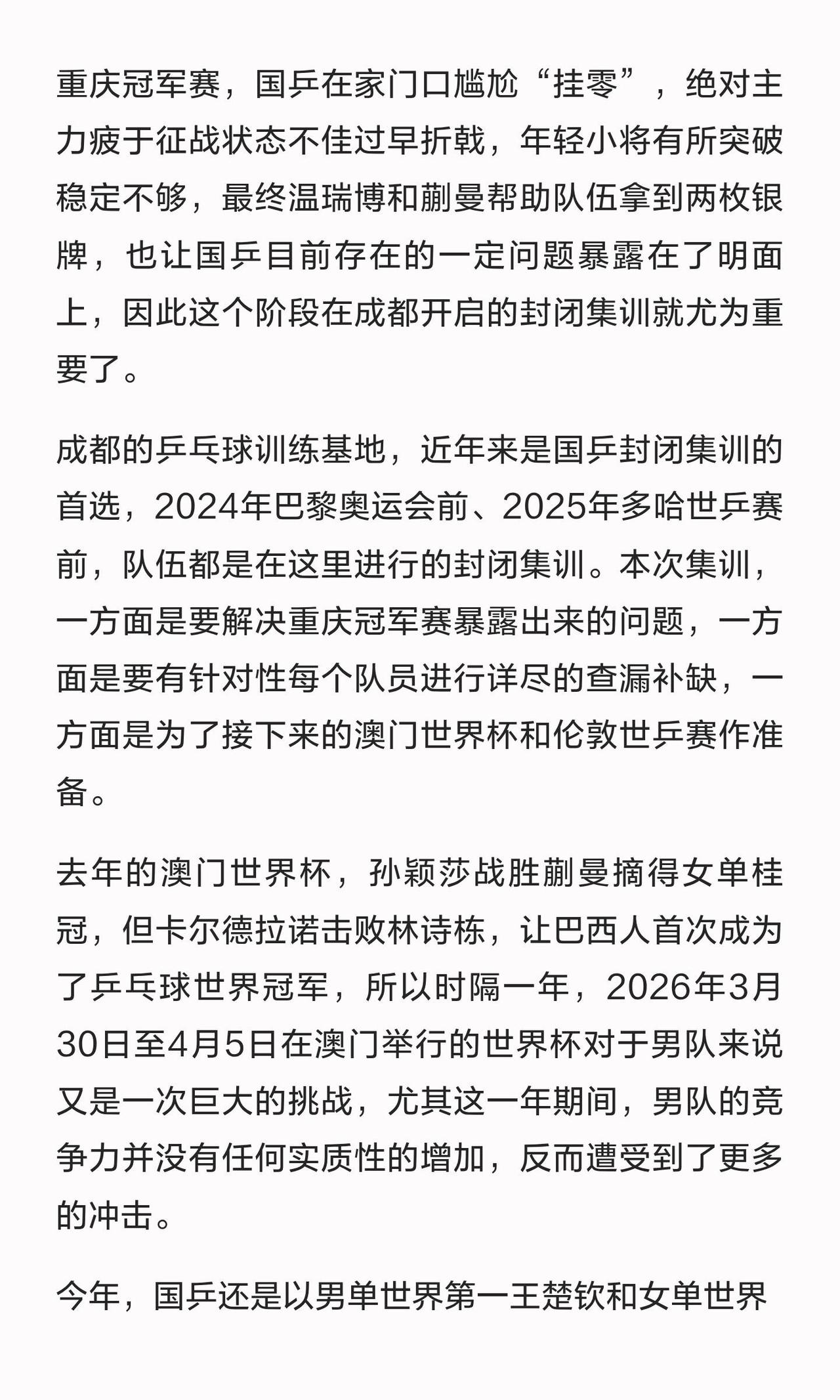 世界杯和世锦赛40天的集训和封闭式,赛事好密集,中秋和国庆都要训练,五一这次在比赛期间,很墨迹,但是自己的努力和汗水,自己知道,雄起,加油! 孙颖莎和王楚钦没有让人失望,冠亚军都是他们一路上的见证,男女线的主力,我们的榜样和力量,他们训练上千万次,努力值得拿到冠军!