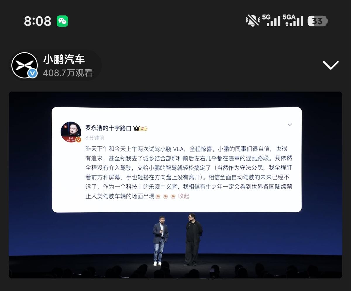 小鹏请罗永浩来宣传智驾 究竟会效果爆棚还是适得其反? 众所周知罗永浩口才和影响力肯定是拉满的 非常会搞话题和流量 今天晚上和何小鹏的直播效果不错 但是众所也周知,罗永浩也被称为“行业冥灯”[捂脸] 而且因为攻击性强毒舌,也有不少人讨厌他 可以说是比较有争议的一个人物 这样带来的流量 也会引发一些争议 就像直播预告一发布 下面评论有人很期待很喜欢罗老师,有人觉得会带来负面影响 我觉得小鹏确实需要更多的曝光 VLA二代智驾很厉害,宣传实在有限 需要破圈 至于会不会带来负面影响,主要还是看小鹏产品够不够硬,只要智驾、汽车真的好,什么流量都能接住 大家觉得呢? 小鹏汽车 罗永浩