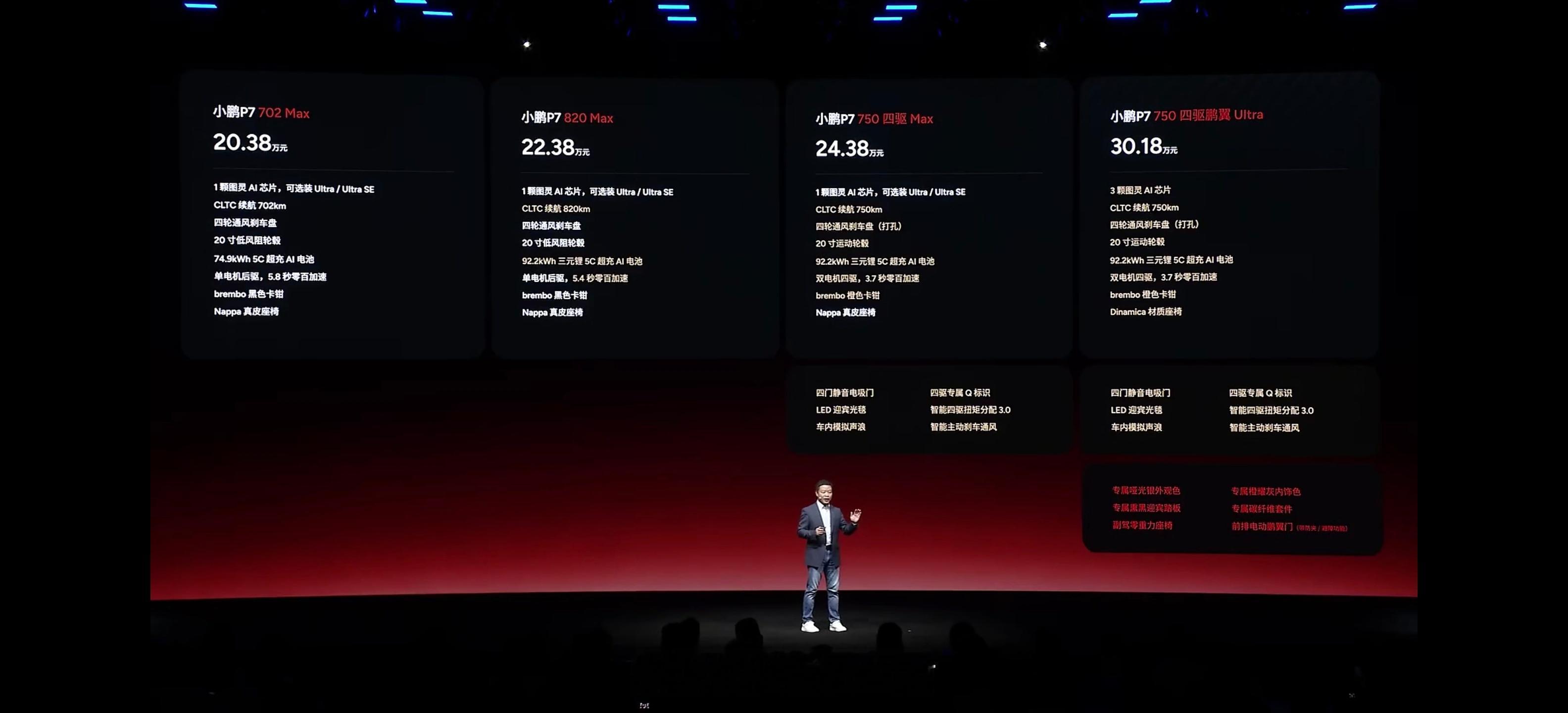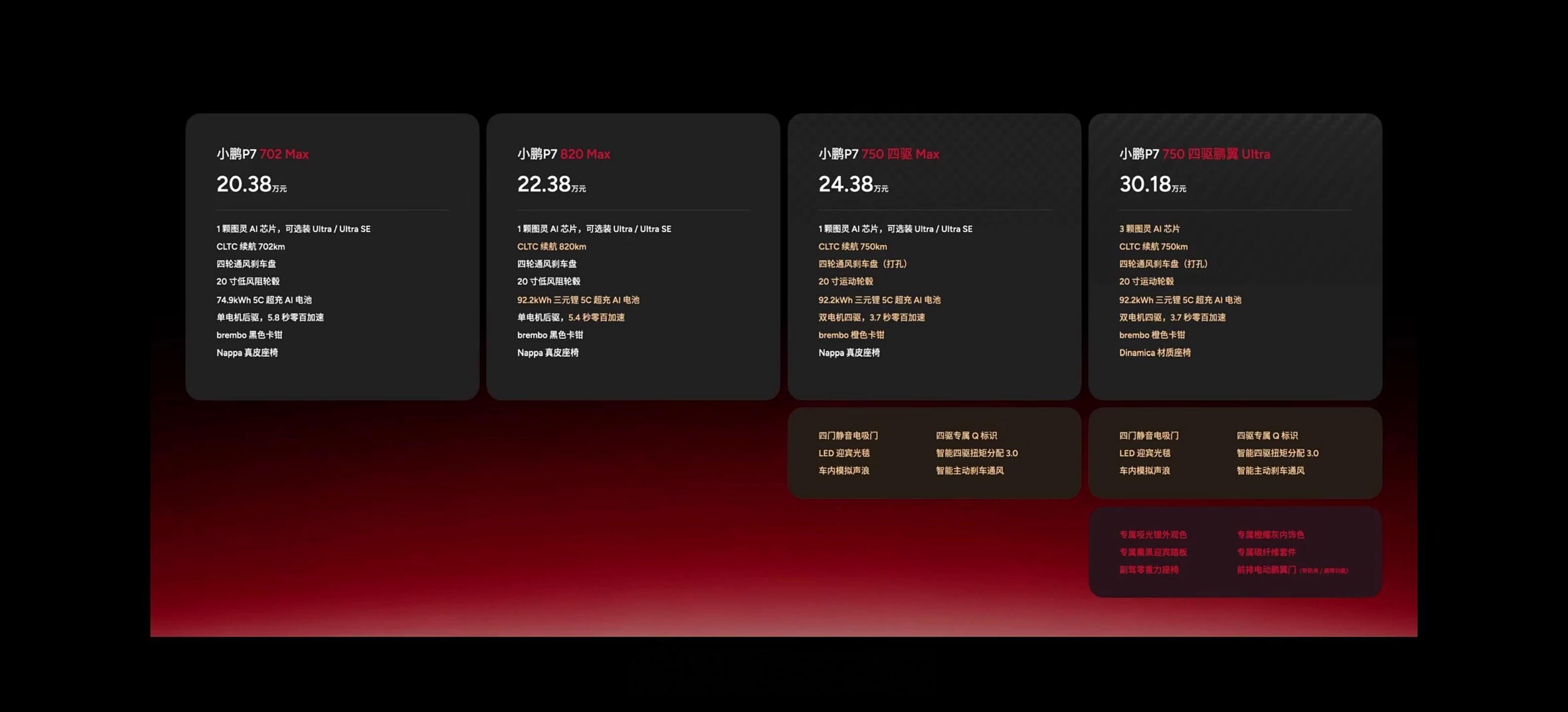 价格来了,小鹏P7 702 Max版20.38万元820 Max版22.38万元750 四驱 Max版24.38万元750 四驱鹏翼 Ultra版30.18万元小鹏P7今晚带来的全新配色以及配置大家满意吗?小鹏p7新色今日发布小鹏p7新色今日发布