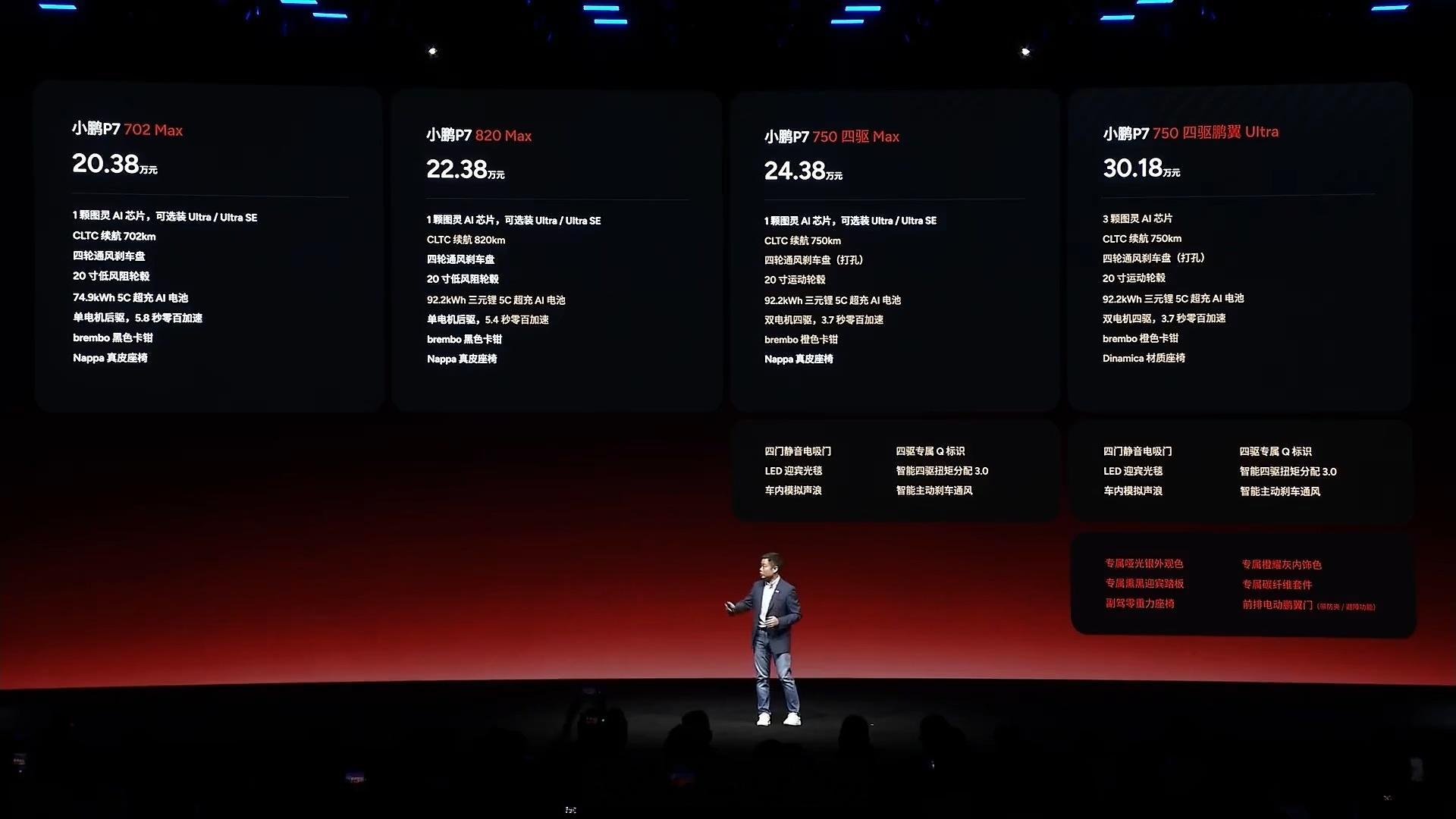 本次发布会上,小鹏P7更新3款全新外观色「星曜红、暗夜黑、星云白」、2款内饰配色「引力红、熔岩灰」以及全新轮毂。同时还新增了一颗图灵芯片的Max版、两颗图灵芯片的Ultra SE(支持第二代VLA),以及三颗图灵芯片的全新图灵四驱Ultra版。