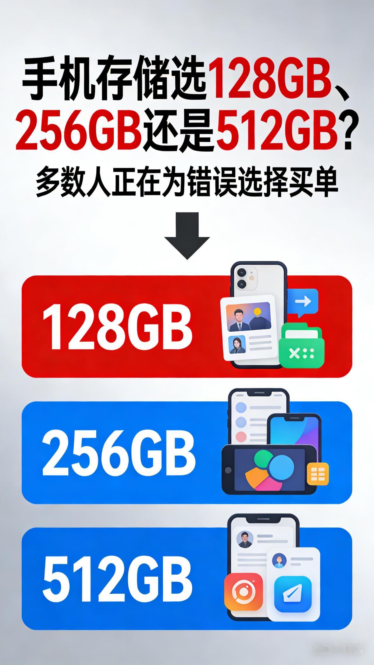手机存储选多大?别让“省几百”变成“悔三年”! 还在纠结手机选128GB、256GB还是512GB?看完这波行业数据,只能说多数人都在为错误选择买单! 2019年还觉得128GB够用,如今微信、游戏安装包疯狂膨胀,系统、影像文件体积翻倍,手机用得越久,存储压力越大。京东数据显示,256GB机型销量占比已超58%,128GB却跌至19%,更扎心的是,因存储不足退货的,128GB占比高达67%! 其实选存储,关键看换机周期和使用强度:1-2年换机选256GB,2-3年及以上,512GB才够稳;重度游戏、爱拍照的,直接冲512GB起步。别小看存储差价,算上二手残值,大存储的实际使用成本没差多少,却能避开清理内存的崩溃时刻! 你的手机存储还剩多少?有没有被存储不足坑过?评论区聊聊你的真实体验~