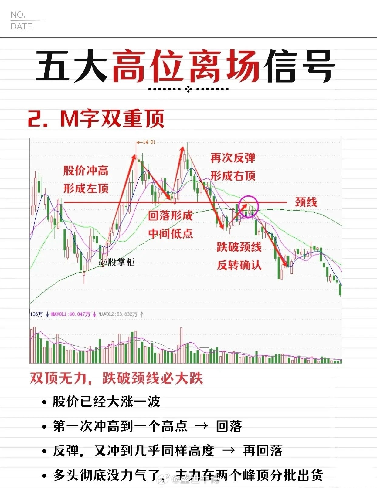 - 形态特征:股价先大涨一波,形成左顶(冲高回落)→ 反弹后再次冲高至相近高度形成右顶→ 两顶之间的回落低点为颈线。当股价跌破颈线时,形态确认。- 信号意义:多头力量耗尽,主力在双顶过程中分批出货,跌破颈线后往往伴随大幅下跌(“双顶无力,跌破颈线必大跌”)。