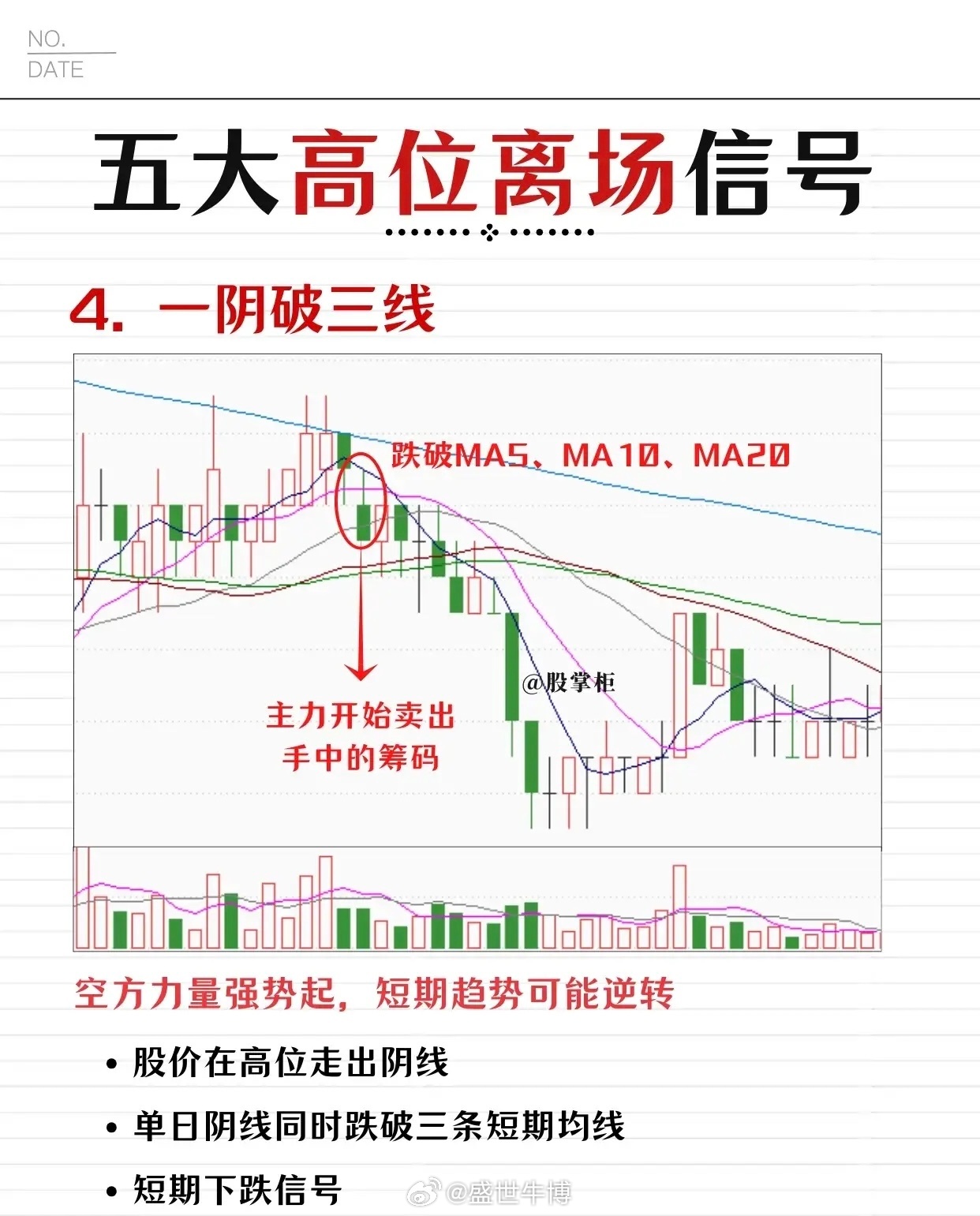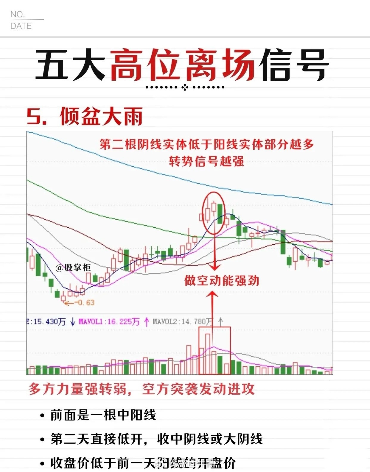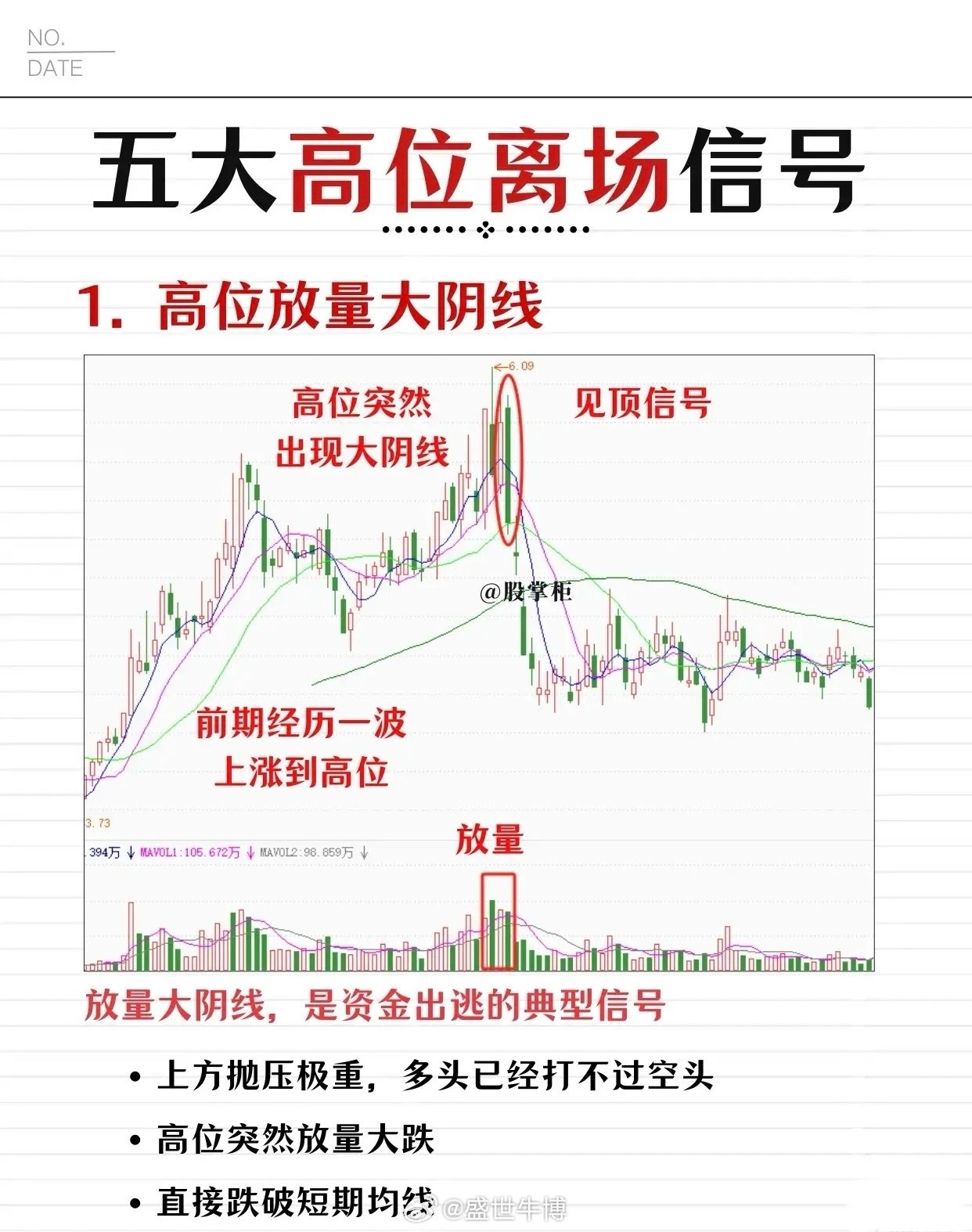 股票投资中五大高位离场信号,用于提示投资者在股价高位时及时卖出,规避下跌风险。以下是详细解读: