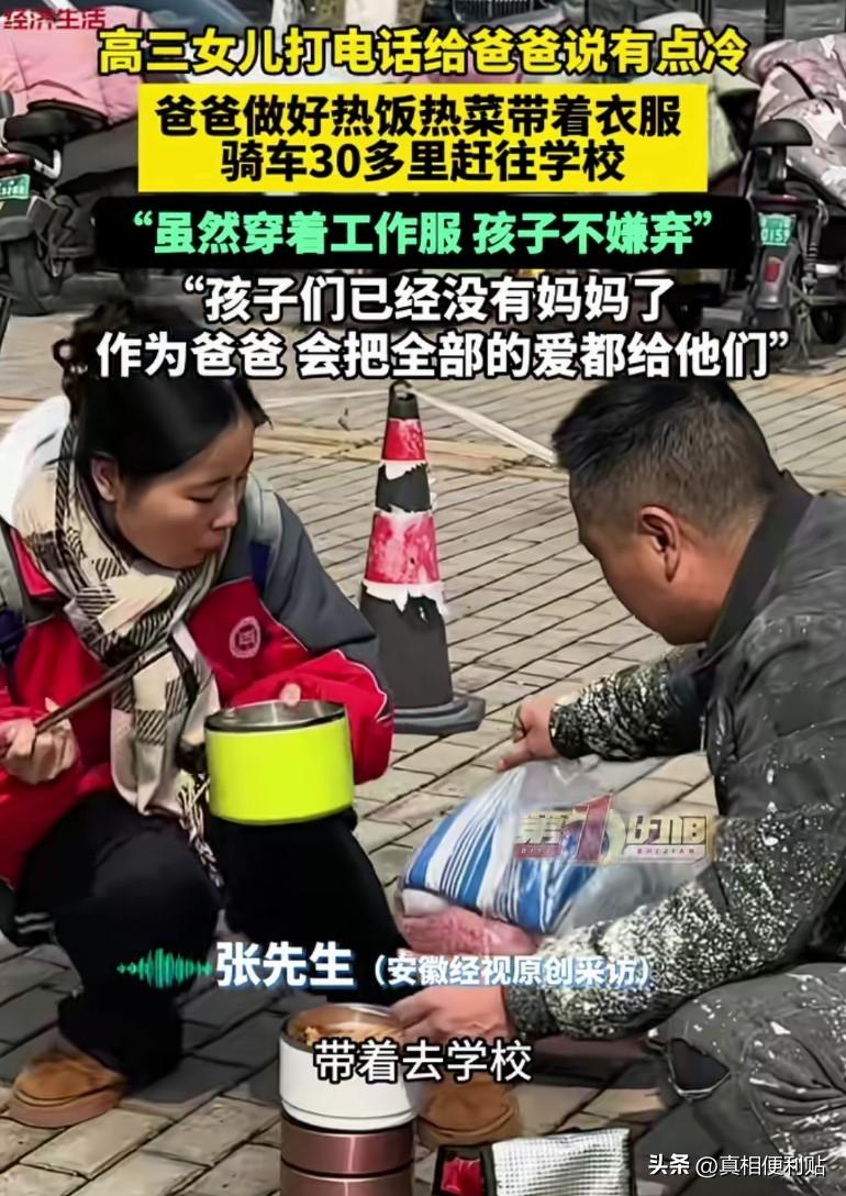 绷不住了!安徽一位高三女儿,晚自习前给爸爸打了个电话,轻轻说了一句:“爸,我有点冷。”就这一句话,单亲爸爸张先生瞬间坐不住了。 冬天的安徽,风刮得呜呜响,窗户玻璃都被拍得啪啪作响。 老张刚下班,正坐在桌前扒拉着晚饭,手里还捏着女儿刚发下来的月考成绩单,看着上面比上次进步了一大截的分数,老张心里那个美啊,连嘴里的饭都觉得格外香。 就在这时,放在桌角的手机突然震动起来,屏幕上跳动着女儿的名字。 他赶紧接通,电话那头传来女儿略带颤抖的声音:“爸,我有点冷。” 这句话还没落地,老张手里的筷子就“啪嗒”一声掉在了桌上。 他连外套都没来得及穿好,胡乱抓起放在沙发上的厚羽绒服、围巾和手套,又顺手从暖壶里倒了杯热牛奶塞进怀里,也没管自己还穿着单薄的毛衣,夺门而出。 老张一个人拉扯女儿这么多年,早就练出了一身本事,虽说学习上帮不上什么大忙,但后勤保障这块,他可是下了狠功夫。 女儿今年高三了,晚自习经常要上到深夜,不管多累多困,他都得等到孩子安全到家才肯睡。 他太了解这孩子了,从小就懂事,有什么委屈从来不吭声,生怕给他添麻烦,这次能主动打电话说冷,说明那是真的冻得受不了了,不是一般的冷。 外面的风像刀子一样割在脸上,刺骨的寒意直往脖子里钻,可老张这会儿完全感觉不到,脑子里只有一个念头:快点,再快点。 平时骑车怎么也得十几分钟的路程,硬是被他压缩到了不到十分钟,甚至连路口的红绿灯都差点没顾上看。 自习前的休息时间,只有那么几分钟,要是错过了,孩子就得挨冻上完这节课。 等到气喘吁吁地赶到校门口时,老张早已满头大汗,衣服也乱糟糟的,但他根本顾不上这些,只是一双眼睛焦急地在进出校门的人群里,搜索着那个熟悉的身影。 很快,他就在教学楼门口看见了女儿,她正和几个同学缩在一起,抱着胳膊,肩膀一耸一耸的,不停地搓着手哈气,显然是冻得够呛。 老张三步并作两步冲了过去,动作麻利地把手里抱着的厚羽绒服给女儿套上,又细心地围好围巾,戴上手套,最后才把一直捂在怀里的那杯热牛奶,塞到她手里:“赶紧喝,趁热,暖和暖和身子。” 女儿捧着还带着体温的热牛奶,眼圈瞬间就红了,虽然父亲没说一句话,但她能想象得到,接到电话后的父亲,是怎样慌张地冲出家门,又是怎样不顾一切地狂奔而来。 看着女儿原本苍白的脸色渐渐红润起来,老张那颗悬着的心,才算是放回了肚子里,他习惯性地摸了摸女儿的头,示意她赶紧回教室去上课,自己则站在门口一直目送,直到那个背影消失在楼梯拐角,这才转身准备离开。 回去的路上,风依然很凉,但老张的心里却是热乎乎的,这些年来的辛苦和不易,仿佛在这一刻全都得到了回报,一切都值了。 这一幕恰好被学校门口值班的保安无意间拍了下来,视频传到网上后迅速引发了刷屏。 网友们被这份沉默而厚重的父爱,深深打动了,仅仅是一句简单的“我冷”,就换来了父亲不顾一切的狂奔和守护。 评论区里全是满满的祝福和感动,大家都读懂了那种最朴素、最真挚的付出——虽然不善言辞,却永远愿意做孩子身后那座最坚实的大山。