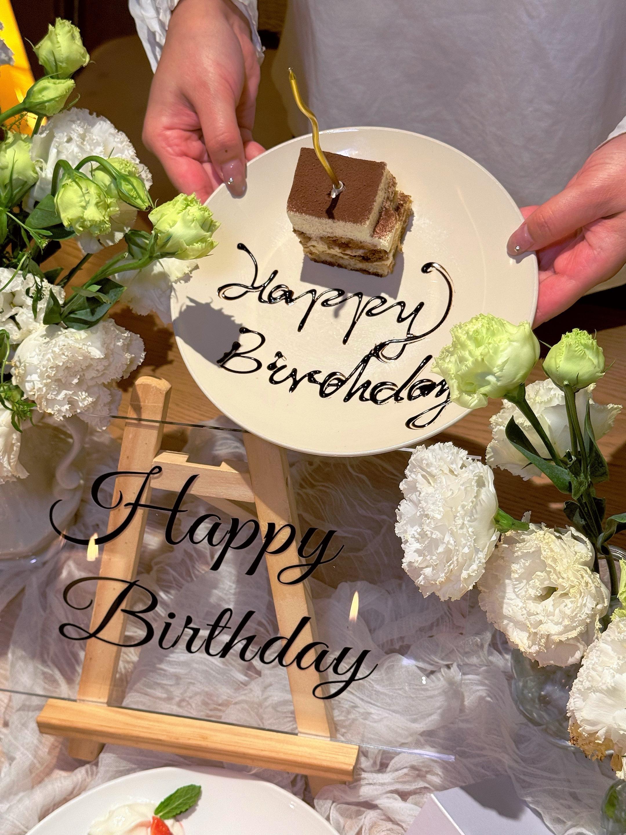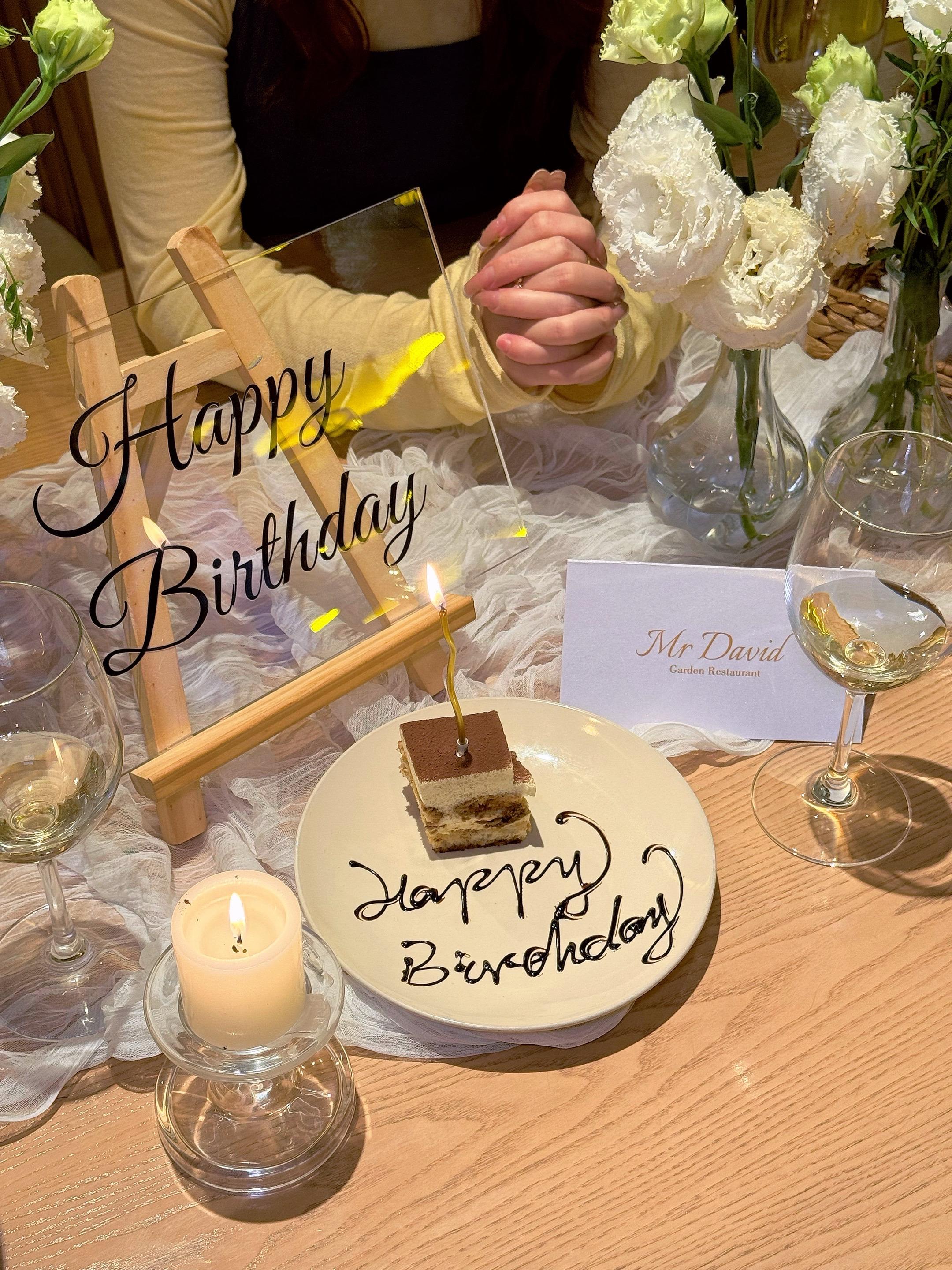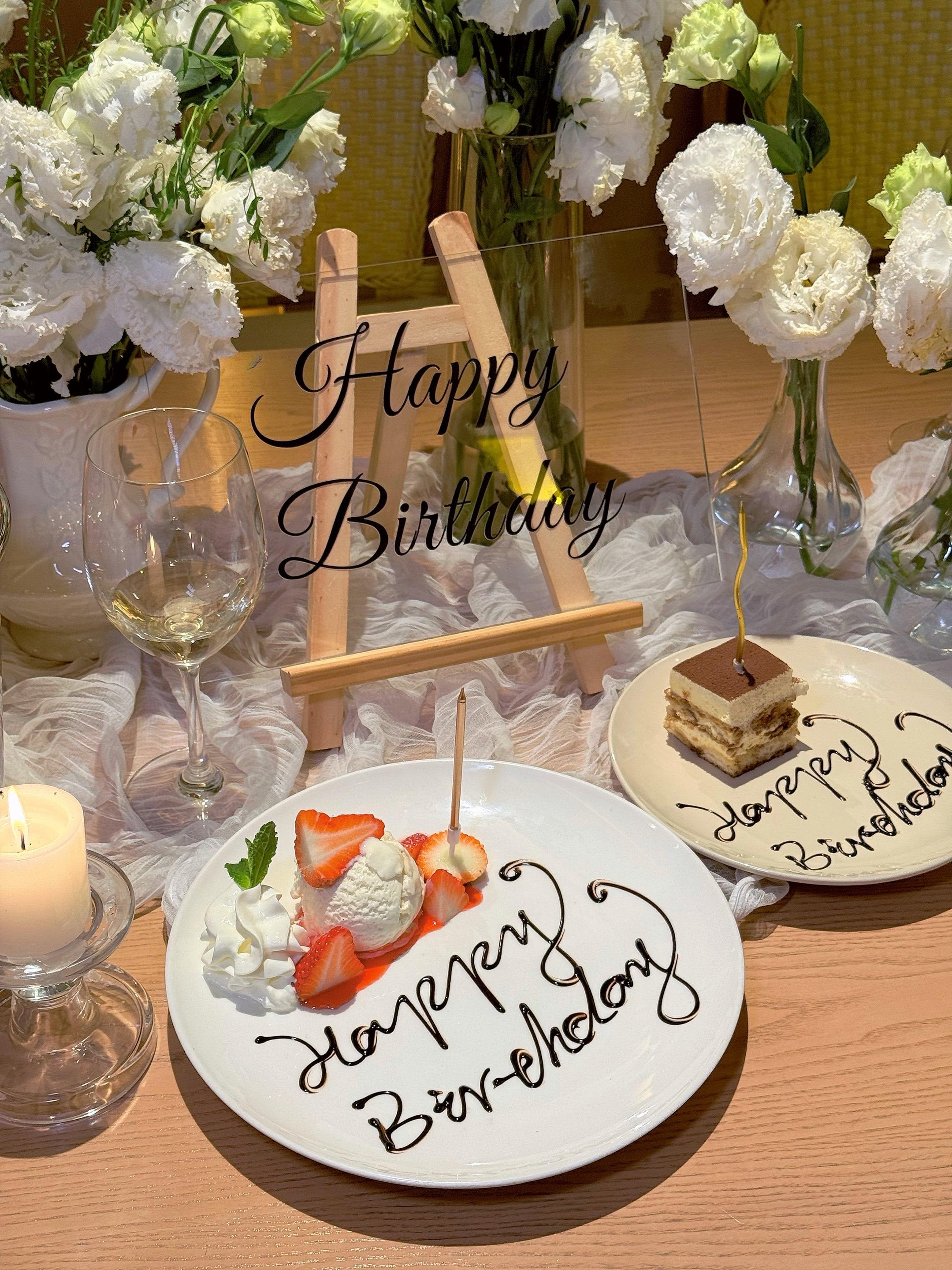 大连男同胞速来抄作业!女友过生日就选这!真的有被这家餐厅认真对待的细节戳中!🥹 提前沟通了生日需求,到店直接被惊喜住: 白绿色系花艺清新雅致,暖黄蜡烛氛围感满分💯,连餐盘上都刻着专属的“Happy Birthday”!仪式感直接拉满!💐 菜品颜值也在线,提拉米苏配草莓冰淇淋,每一口都是生日专属的甜~ 不用自己费心布置,就能拥有一场精致又浪漫的生日宴,这种被宠爱的感觉也太幸福啦!❤️