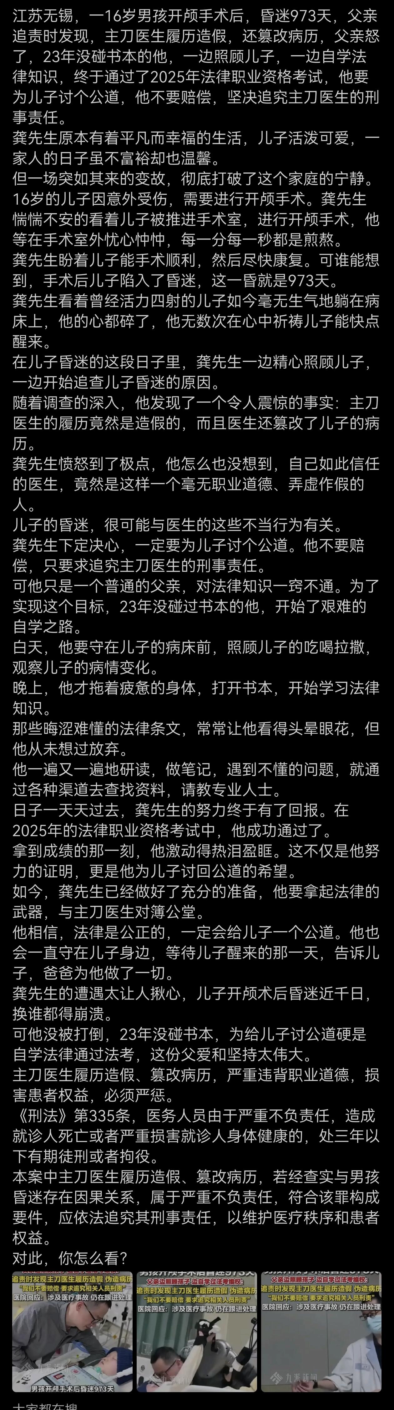 江苏无锡,有个16岁男孩开颅手术后,一昏迷就是973天。谁也没料到,孩子的父亲龚