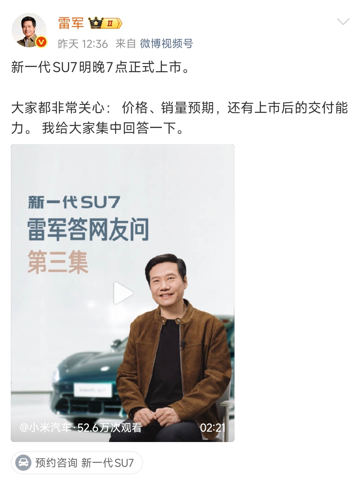 新一代小米SU7 今晚就要发布了,从春节前宣布预计4月上市至今,3个多月的时间里很多人都在讨论新SU7的销量能否超越第一代SU7,大家争论不下,但都接受一个观点:能够超越小米的只有小米。