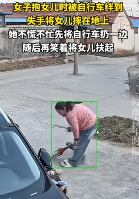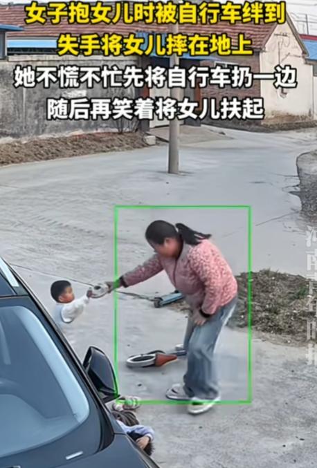 女子这顿操作,感觉这她不是亲妈。 山东,一女子抱女儿时被自行车绊倒,失手将女儿