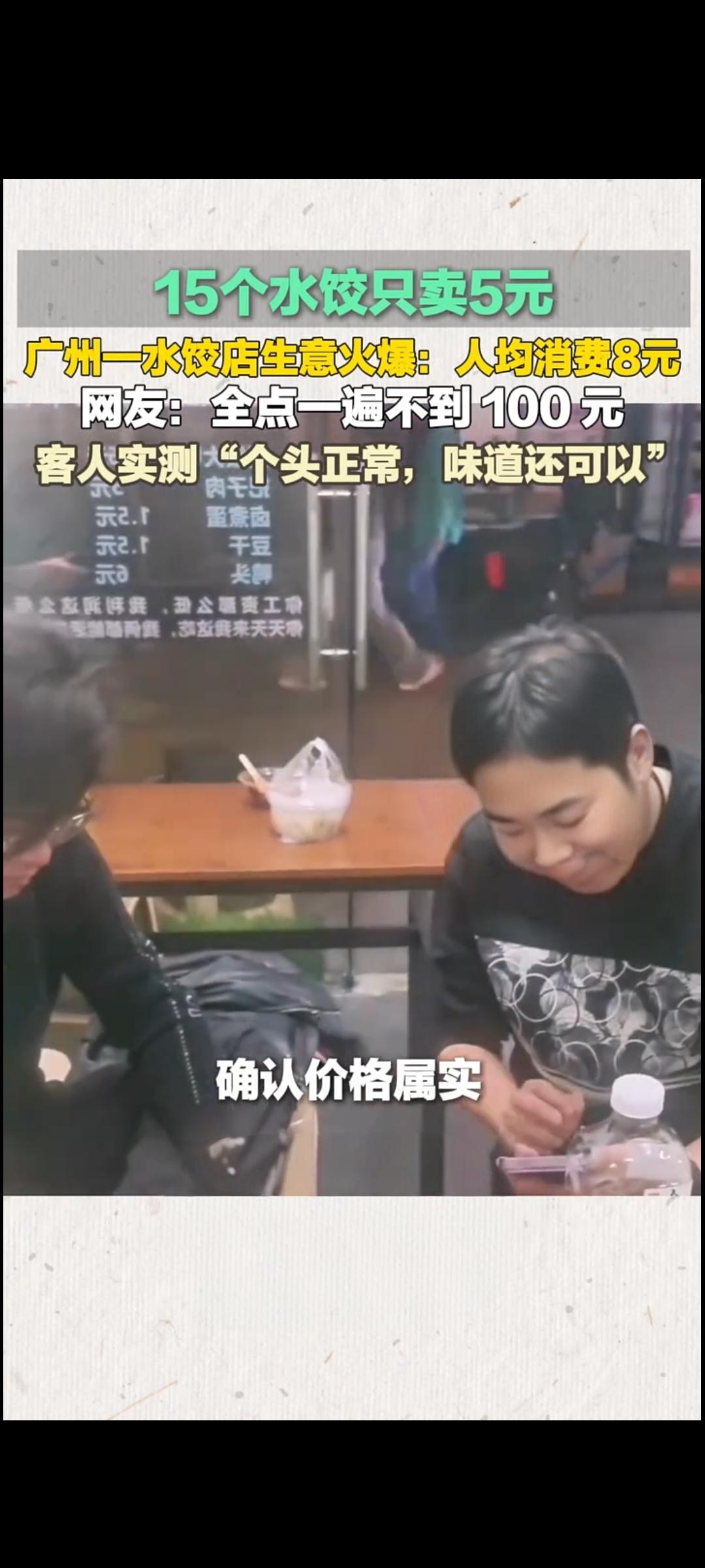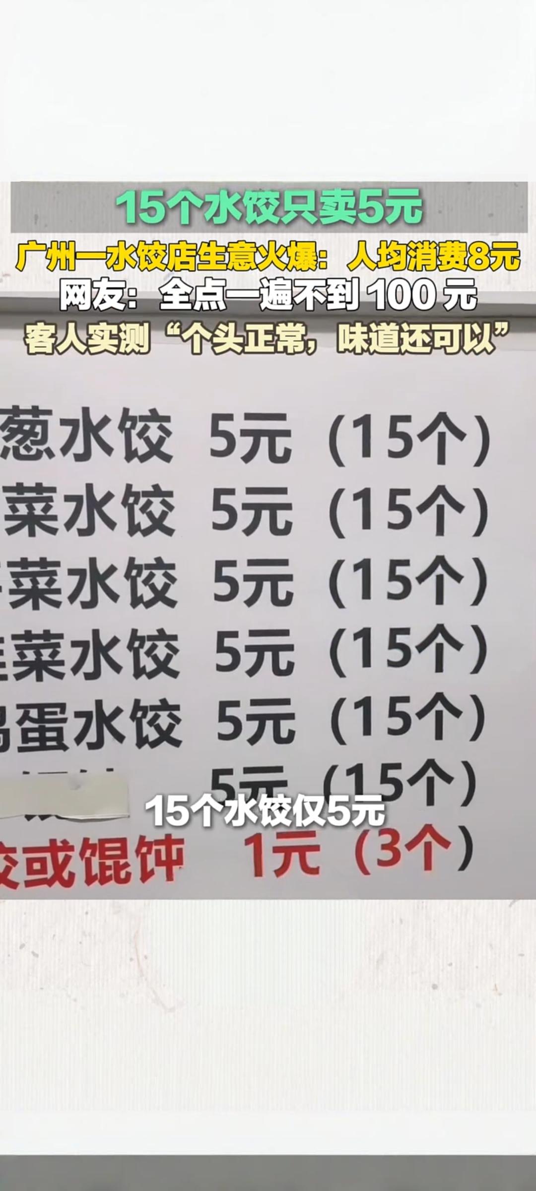 广州一水饺店5元15个引热捧 人均8元成民生美食标杆 近日,广州市天河区一家水饺店因超高性价比走红,相关视频在快手平台播放量达6.9万次,成为本地民生消费热门话题。该店推出15个水饺仅售5元的亲民定价,人均消费8元即可吃饱吃好,凭借实在的价格和稳定的品质收获食客青睐。 据实地探访,这家位于黄村东路的水饺店门头上标有“让物价回归90年代”的标语,菜单定价十分接地气,除5元水饺外,青菜面4元、雪菜肉丝面5元,店内最贵面食也仅8元,老板还在菜单上注明“利润低”,直言不做高价套路。不少食客起初担心低价低质,实测后纷纷表示,店内水饺个头正常、馅料扎实,味道符合家常预期,完全不输同品类高价店铺。 每到午餐时段,该店便座无虚席,外卖订单也接连不断,附近商户证实其定价在周边商圈极具竞争力。店主通过家庭式经营、压缩装修与运营成本,以薄利多销的模式实现经营,既让周边上班族、社区居民吃到实惠美食,也用真诚的经营理念打动消费者。 在物价走高的当下,这家水饺店用极致性价比诠释了城市烟火气,不仅成为打工人、学生党的“暖心食堂”,也为平价餐饮经营提供了新思路,让消费者看到实惠美食背后的民生温度。 广州饺子馆 鲜美味水饺店 暖心水饺