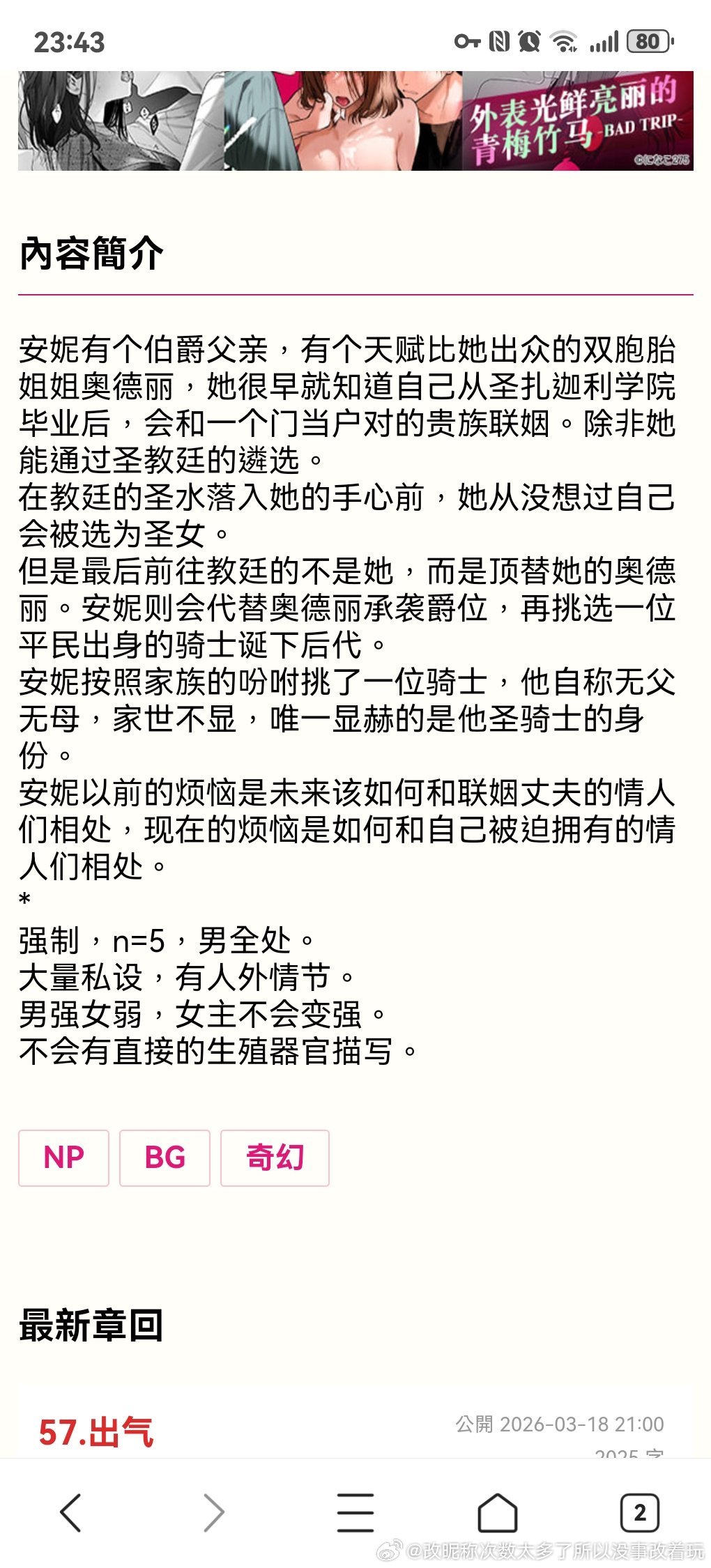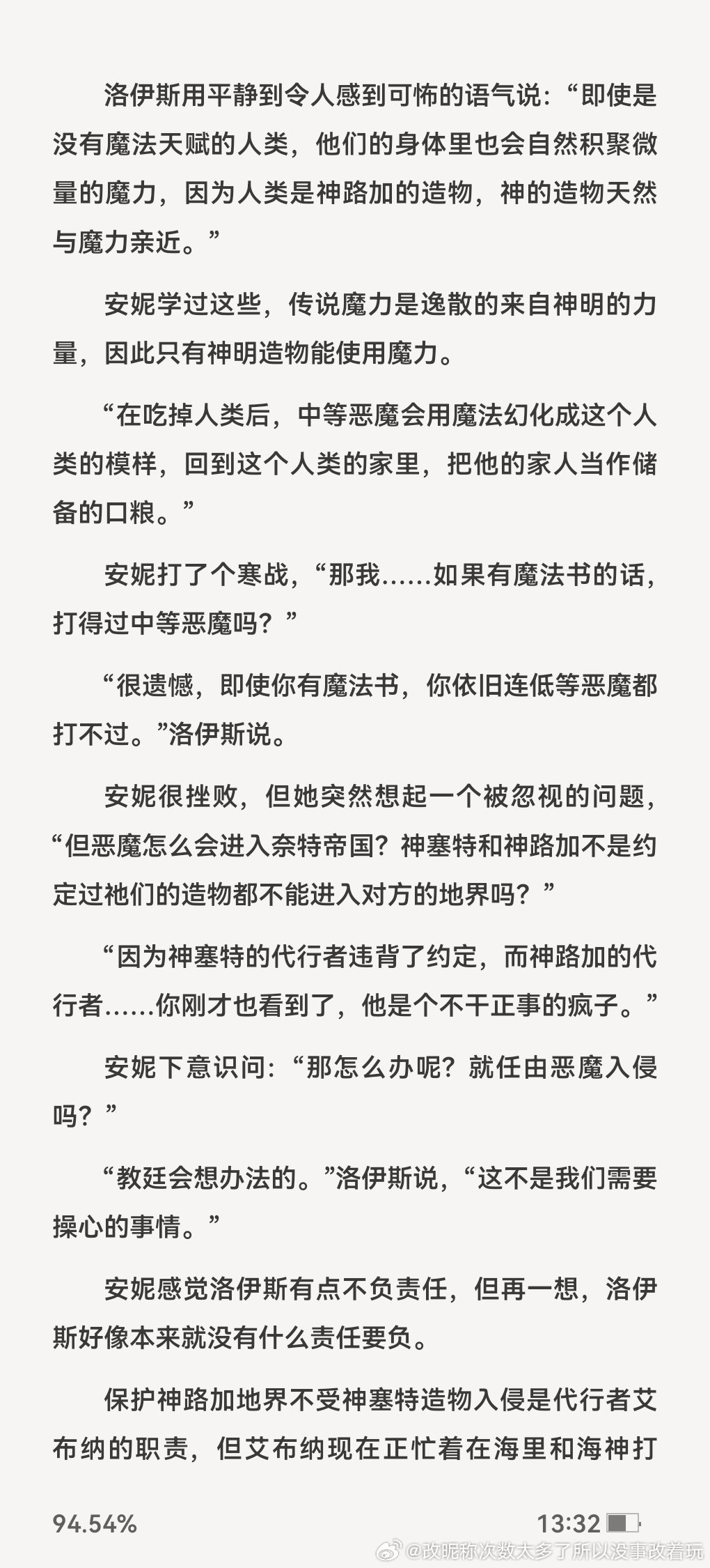推文 亲测推文日记*欢迎推荐言情好文159今天也在被强制爱吗(西幻 np) 5星前几天提过正在看的西幻文,po西幻不是冷门,西幻文很多但是感觉有自己的“设定”而不是套壳西幻的还蛮少,这本目前看感觉有前面就写得很明显了但新的更新直接讲出来了,女主就是创世神之一的光明神路加的转世之前兔日天也写了一本女主是创世神的西幻 np,没这本好看,创世神的力量、存在,创世神和它的造物的关系,这本目前都设定得蛮好的,不套路、很具体肉戏比较像早中期的jj那种微肉,淡淡的,目前男主有创世神光明神路加的代行者(天使)、精灵、龙、海神(人鱼)、皇太子+人之子(一个有灵魂的人类)、可能还有创世神黑暗神的代行者目前意外比较喜欢龙有点臭屁自恋噬甜的还挺可爱,其次代行者、有种爱玩的创世神背后辛辛苦苦干活的男人的感觉你们可以看下P16,这章解释了女主的“身份”和跟代行者的渊源