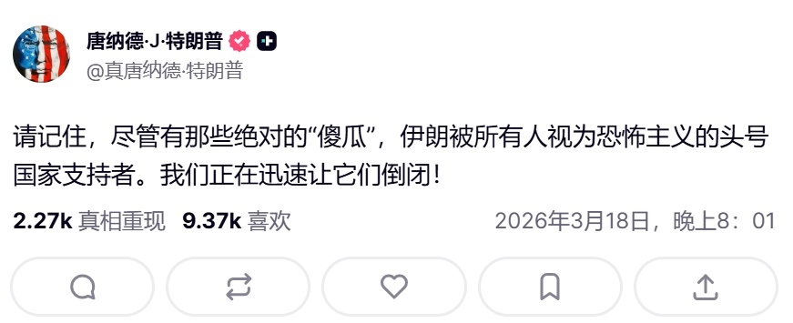 特朗普一个小时内连发三文,要求北约出兵护航霍尔木兹海峡。美伊以冲突热点观点霍尔木