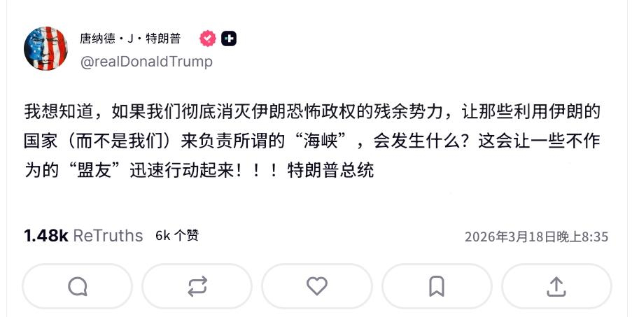 特朗普一个小时内连发三文,要求北约出兵护航霍尔木兹海峡。美伊以冲突热点观点霍尔木兹海峡被封谁会先断油