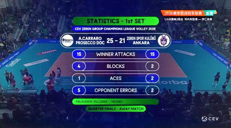 欧冠1/4决赛次回合!! 泽仁体育做客科内利亚诺主场!! 科内利亚诺25-21拿下首局!!这一局朱婷6扣4中拿到4分,哈克12扣8中拿到8分,俩人发挥都不错,替加比首发的西拉拿到3分!!目前第二局比赛正在进行中,科内利亚诺7-6领先泽仁体育,只要再拿下这局,科内利亚诺即可晋级半决赛!!加油科内、加油朱婷!!朱婷 科内利亚诺