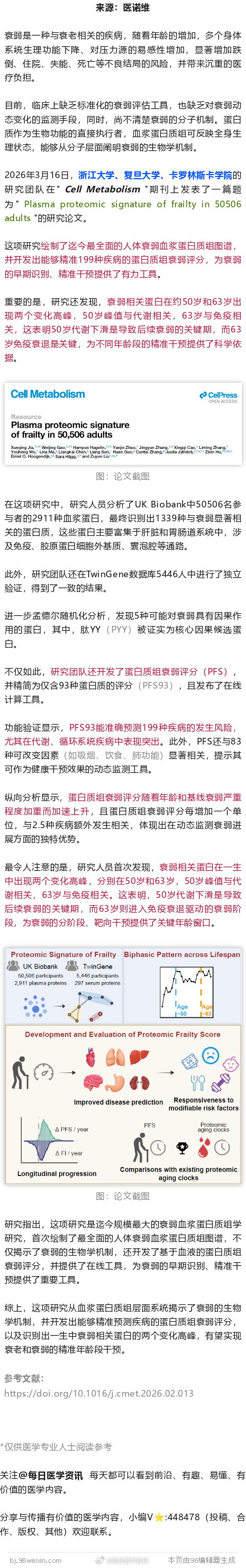 2026年3月16日,浙江大学、复旦大学、卡罗林斯卡学院的研究团队在" Cell Metabolism "期刊上发表了一篇题为" Plasma proteomic signature of frailty in 50506 adults "的研究论文。