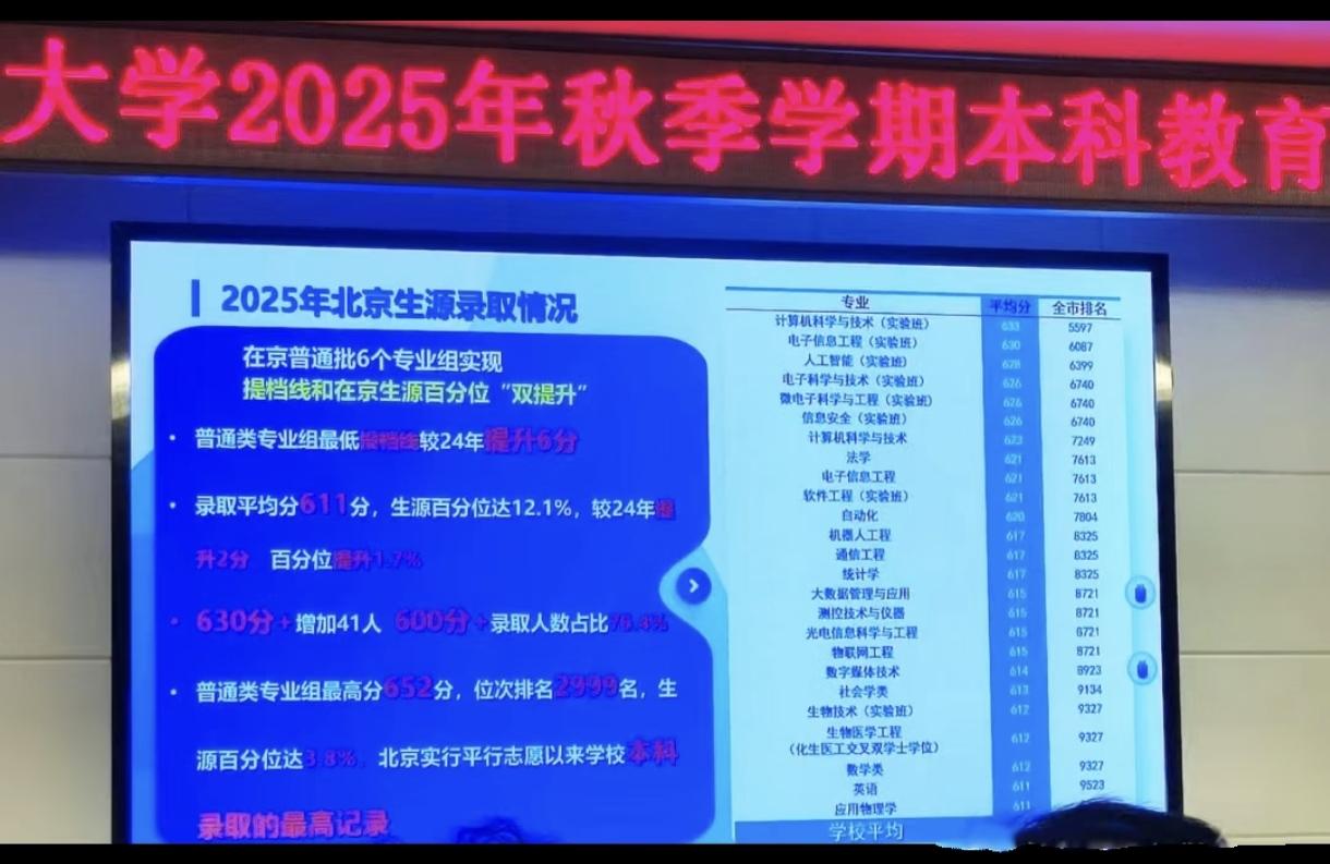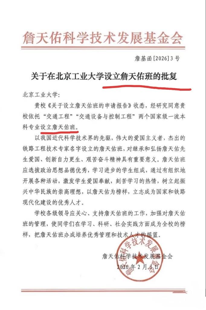 北京工业大学又有动作了,获批设立“詹天佑班”。是的,这是北工大,不是北京交通大学的詹天佑班。 为了吸引优质生源,作为市属唯一211高校的北京工业大学,近日向社会官宣获批设立“詹天佑班”。该班依托“交通工程”及“交通设备与控制工程”这两个国家级一流本科专业设立。可以说,本次北工大获批的“詹天佑班”就是其传统王牌专业的又一次加强与升级,要的就是资源叠buff. 你们来预测一下,今年新设立的这个“詹天佑实验班”,会不会并入去年那个“王炸”03专业组? 2025年北工大北京生源录取情况还是不错的,最高分来到了恐怖的652分,在京普通批6个专业组实现提档线和在京生源百分位“双提升” 具体表现在: 1,普通类专业组最低提档线较24年提升6分; 2,录取平均分611分,生源百分位达12.1%,较24年提升2分、百分位提升1.7%; 3,630分+增加41人,600分+录取人数占比78.4%; 4,普通类专业组最高分652分,位次排名2999名,生源百分位达1.8%,北京实行平行志愿以来学校本科录取的最高记录。 5,计算机实验班录取平均分达到了633分,这个分数可以去很多985高校不错的专业了。 由于高考人数的增加,今年北工大有望进一步小幅扩招,由于宿舍和教育资源的限制,今年不会太大。在2028年房山校区建好之后,北工大有可能再一次大幅扩招,应对来势汹汹的学生潮。