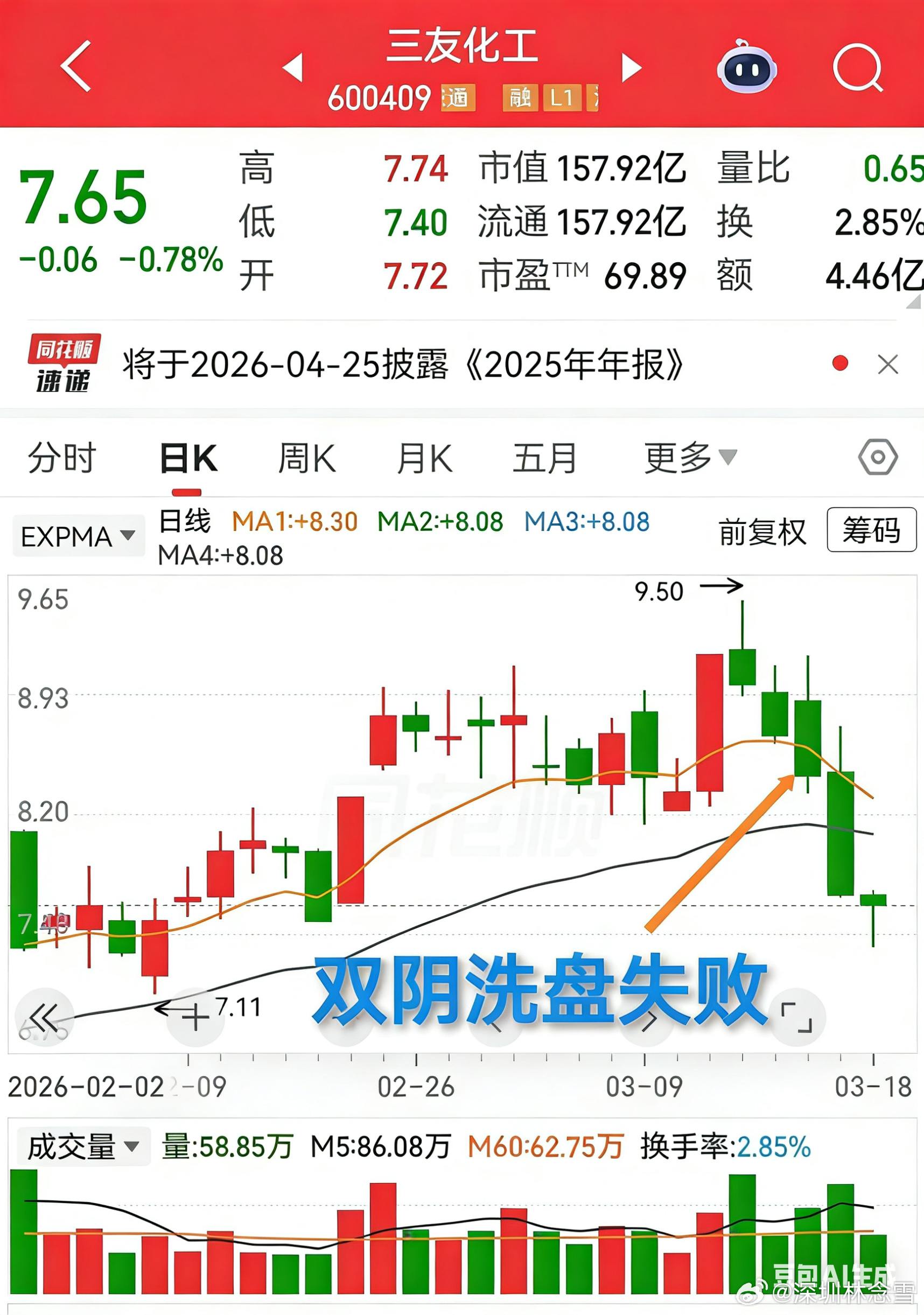 三友化工:双阴量能平淡,形态辨识度不足,破位下探,暂无企稳信号