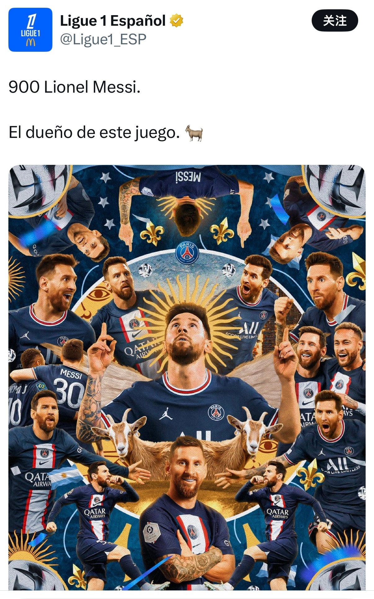法甲官推也来祝贺梅西900球里程碑⚽文案:900。史上最佳球员。莱昂内尔·梅西。