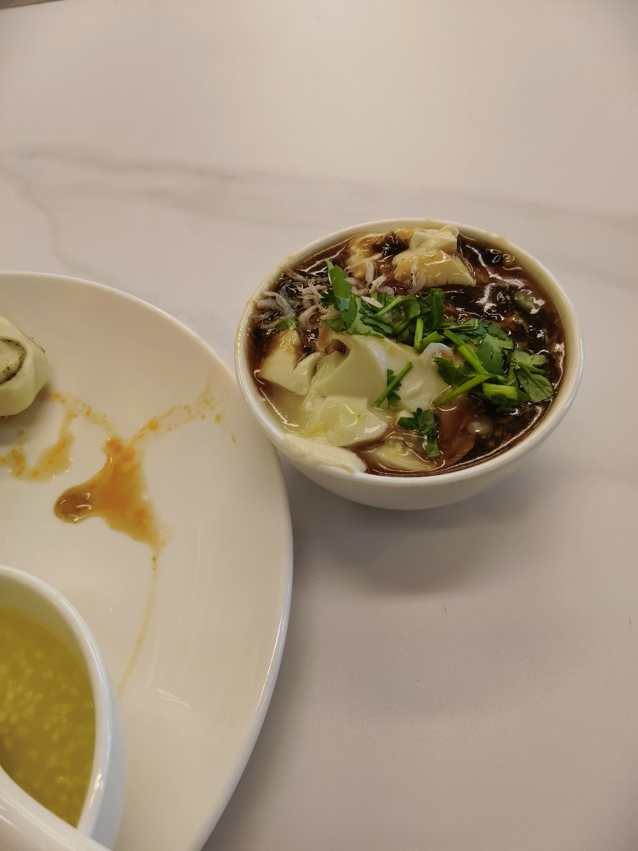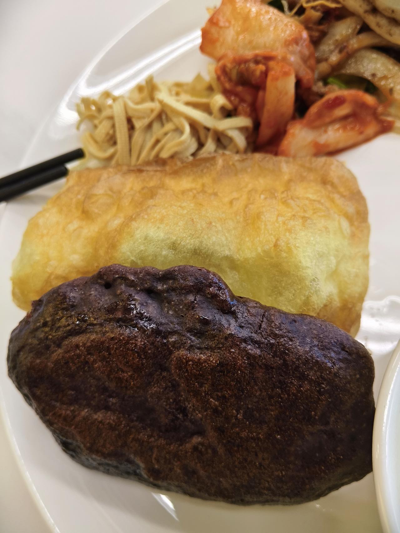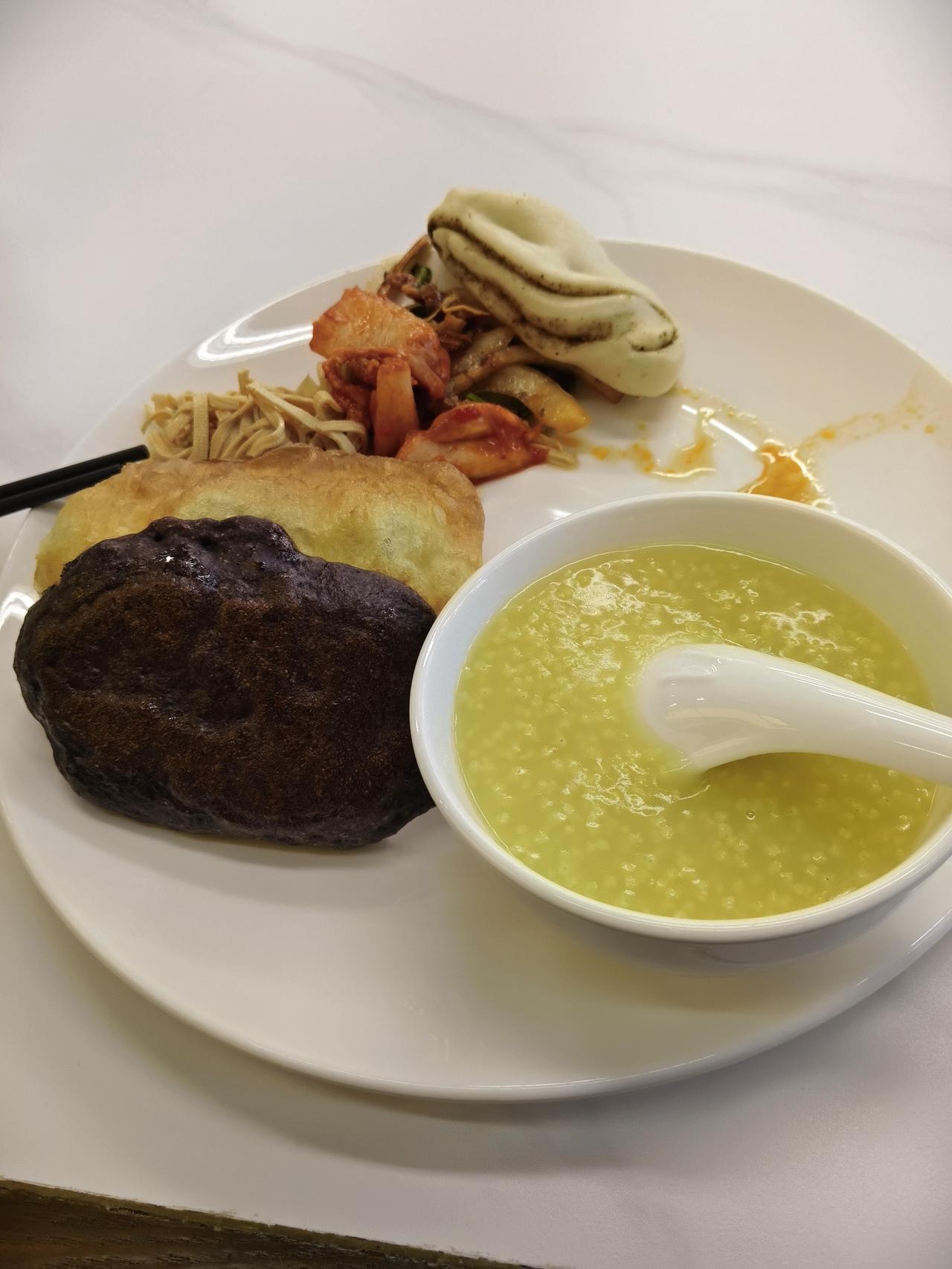 美好的一天,从早餐开始:豆腐脑油条,煮鸡蛋。黑米饼,豆沙卷;黄瓜粉皮,圆葱银鱼,