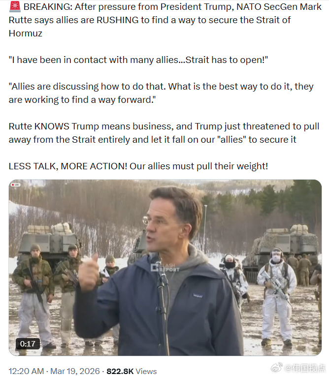 在特朗普总统施压后,北约秘书长马克·吕特表示,各盟国正争分夺秒寻找确保霍尔木兹海峡安全的办法。