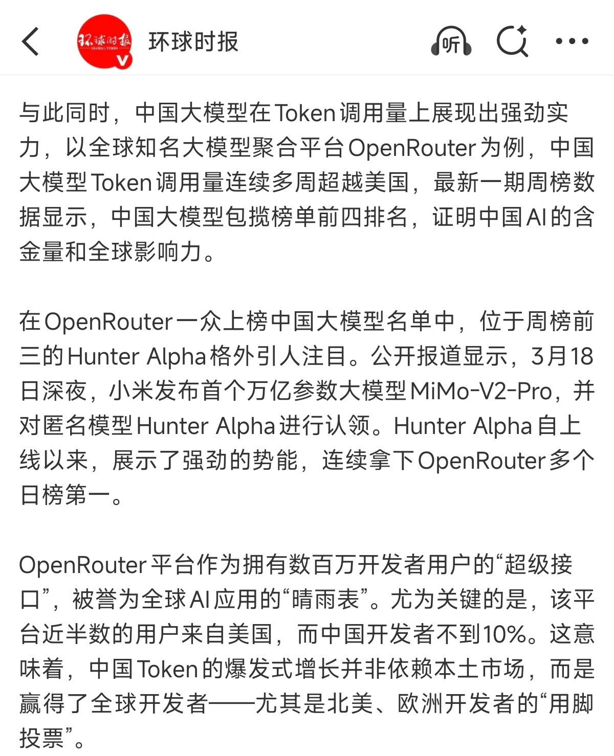 中国大模型调用量包揽全球前四是的,全球第三/连续多日日榜第一的那个Hunter Alpha,就是小米在凌晨官宣的万亿参数大模型 Mimo-V2-Pro。