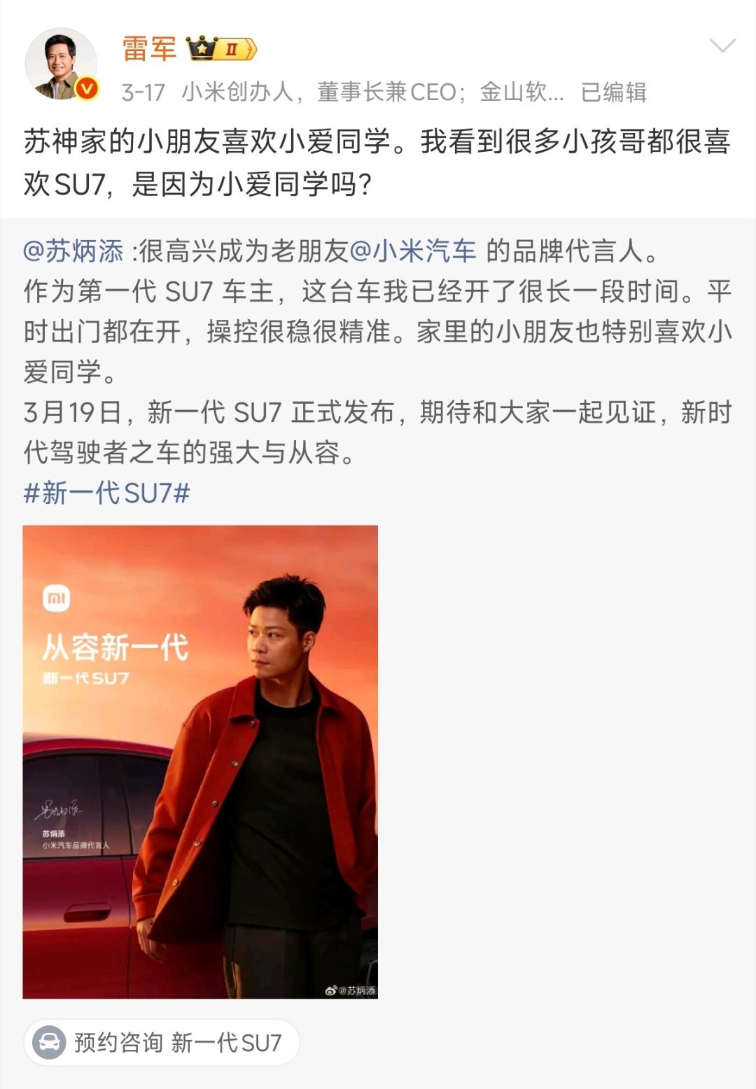 新一代SU7 品牌代言人:苏炳添、舒淇