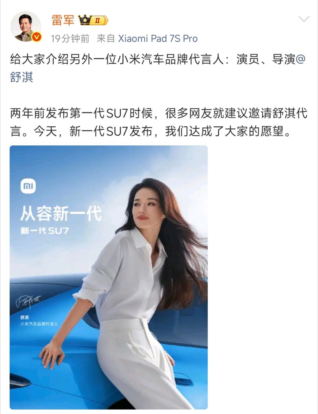 两年前,就有网友联系请 舒淇代言,刚好与SU7 谐音。