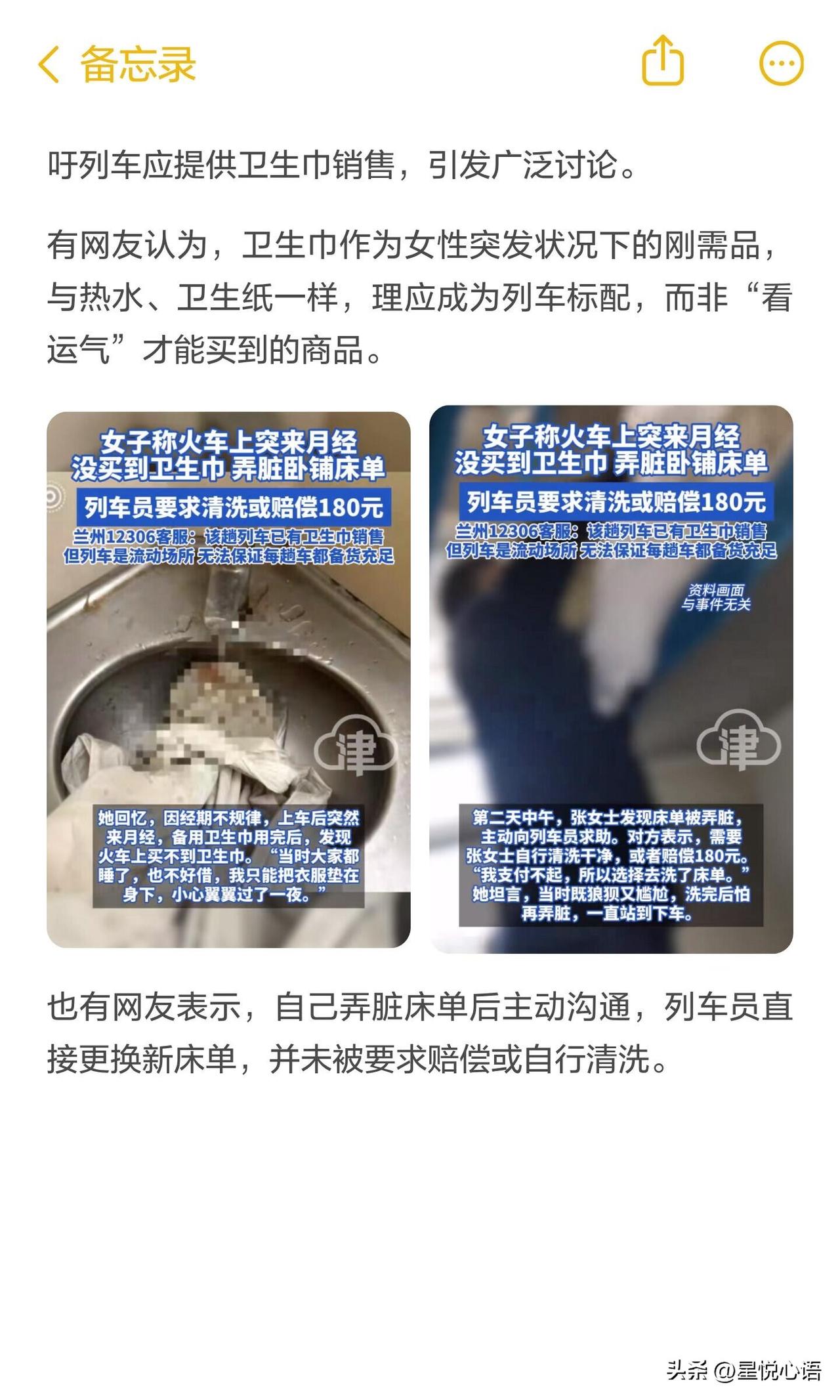 K228次列车这个事,真为女生心疼! 女生火车上突来月经,车上买不到卫生巾,深夜不好找人借,只能拿衣服垫着熬一夜,最后还是不小心弄脏了床单。结果被列车员要求要么自己洗,要么赔180元,没钱只能硬着头皮洗,洗完还怕再弄脏,一路站到下车,又狼狈又委屈。 生理期又不是能控制的,这哪是故意损坏物品啊?12306说有卫生巾卖但备货不足,这跟没有有啥区别!为啥香烟是标配?卫生巾是女性刚需,就该和卫生纸、热水一样,成为列车标配,不能靠碰运气。 还有人说有的列车会直接换床单,处理方式全凭运气,这明显是规则有问题。公共服务不能只讲规矩没温度,希望铁路部门真的上点心,把刚需品备足,定个合理的处理标准,别再让女生出门再遇这种糟心事了!