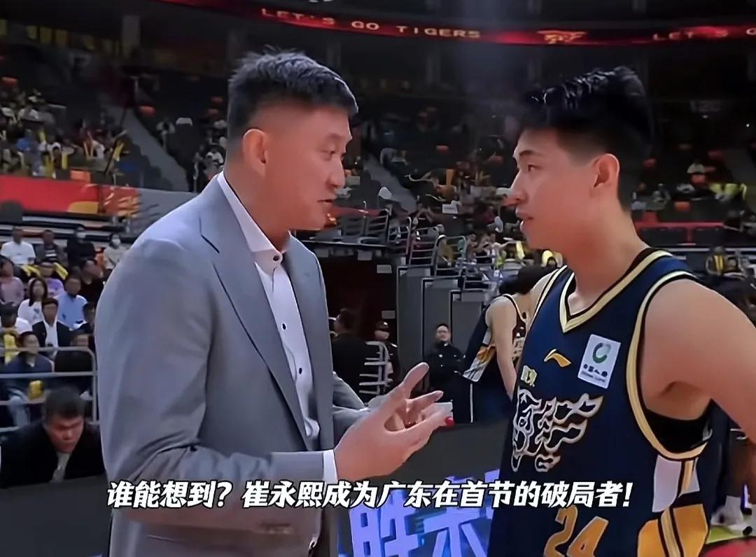 崔永熙:怎么样,老板。 陈海涛:你浪险,关键是给球队注入活力,给队友鼓气,你的性格很适应这支球队。 ——小崔复出第二场帮助球队打开局面,表现不错,由于近期主场连输,打新疆这场空位很多,陈海涛很肉痛,你看看收入大缩水,好在大比分拿下新疆,所以拉着崔永熙的手,爱不释手。 杜锋:根据运动机能生理学,这场让你打16分钟左右,感觉怎么样,会不会有透支感觉。 崔永熙:你过浪险,连我身体状况都知道。 杜锋:不是我吹,我会当教练还会心理学,还会了解运动员伤后高强度身体疲劳度反应各种状况,不然怎么还能当书记主任会长呢。 ——广东队接下来两连客,打江苏和上海,还得靠崔永熙,杜锋跟他讲没事多跟其他球员沟通,给他们打气,最近很多球迷有对他不满现象,他都知道,目前主要是球队士气提升,把这任务交给你,你会完成的。 崔永熙从小梦想就是来广东队,如果愿望实现,他也暗下决心,成为第二个易建联一样人物。