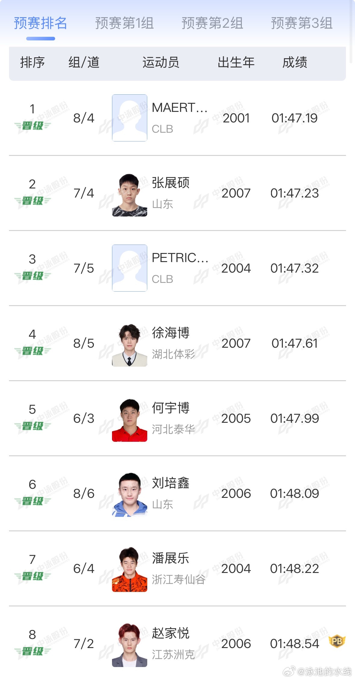 2026年中国游泳公开赛 男子200米自由泳预赛成绩MAERTENS Lukas 1:47.19张展硕 1:47.23PETRIC William 1:47.32徐海博 1:47.61何宇博 1:47.99刘培鑫 1:48.09潘展乐 1:48.22赵家悦 1:48.54 PB